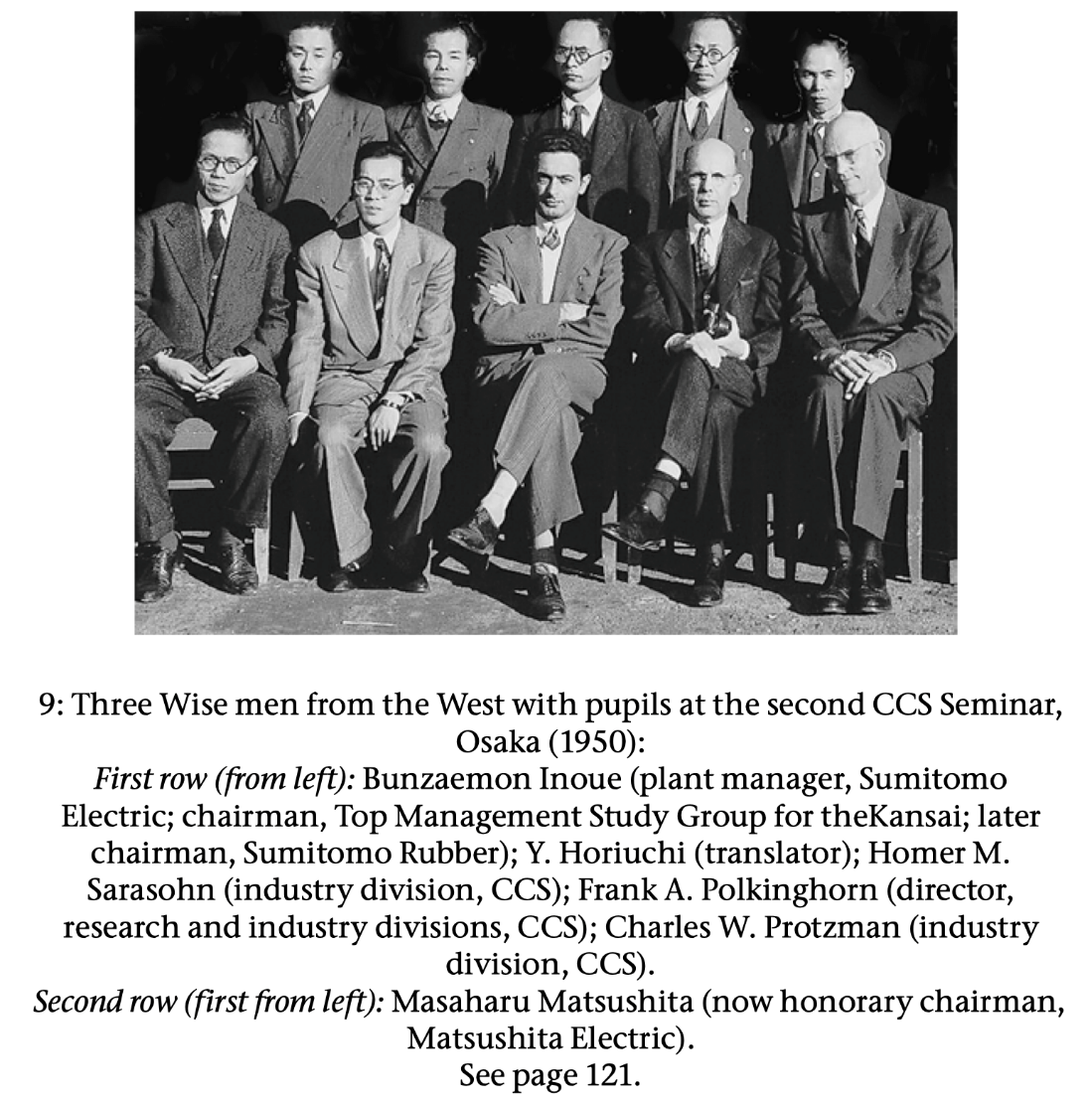 汪丁丁:中立要么不发言,要么一次发表这样多的精彩评论或感受,难怪有朋友说你是重量级的学生。我前年课堂的心智地图里,贴了四本野中郁次郎的著作,中译本的全套,但我也意识到这位老先生偏重哲学而且是法国哲学,特别是“场域”,简直是他的知识创造型企业的核心。他谈论黑格尔,也引发我的好感。毕竟我们这一代人也深受黑格尔哲学的影响,马克思主义的三大来源当中最核心的一个。以致我和老友邓晓芒都认为21世纪是黑格尔的世纪,虽然20世纪也许是康德的世纪。但我觉着野中郁次郎的哲学,运用于企业创新活动,略嫌僵硬,尽管还有那些示意图。总之,我后来就不再介绍他。甚至在他辞世时,也没有建议《财新周刊》写“逝者”文章。德鲁克是维也纳学派的参与者,年轻时也是他父亲沙龙里那些后来影响西方文明的许多人物的小朋友(参见他太早发表的自传《旁观者》)。德鲁克的思想,其实是奥匈帝国知识精英们熏陶的余绪,若非如此,他的第一本著作不会成为丘吉尔建议的预备役军官“必读”。他晚年在一张小纸片上颇自豪地写下自己的三大贡献之一:东亚经济奇迹是他的管理思想之子。德鲁克这一相当自负的判断,有一个旁证,就是中译本《清教徒的礼物》(英文版是2007年发表的)。我截图请诸友看看,那就是西方三位智者(麦克阿瑟将军紧急请来的无线电工程师及管理者)在大阪为日本企业家开办的“黄埔二期”管理培训班合影。