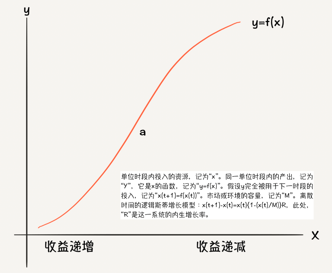 在最普适的意义上,生命只有一个输入,称为“资源”,在横轴上的X,只有一个输出,称为“繁衍”,在纵轴上的Y。从输入到输出,是生命系统的“黑盒子”(通常不可观测),记为函数或映射F。生命周期的右端,资源耗竭,繁衍停止。这条曲线被称为“增长曲线”,更常被称为“逻辑斯蒂曲线”,它并不描述繁衍停止之后的死亡过程。