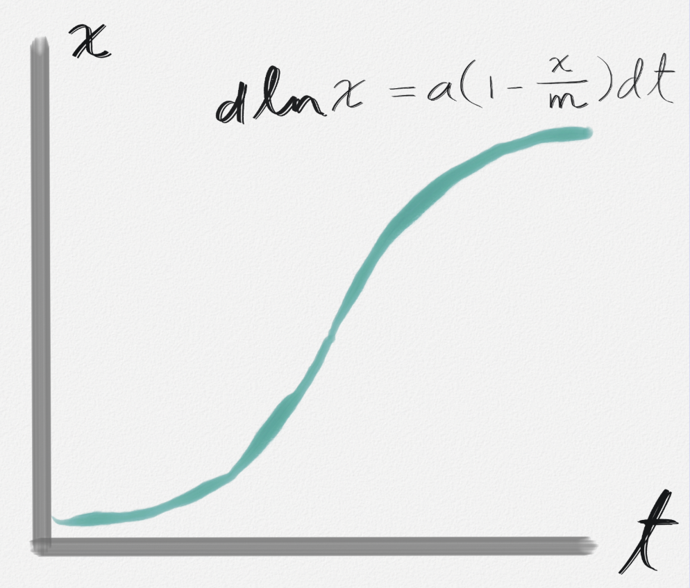 这是我手绘的逻辑斯蒂方程的全微分形式,两边同时除以“dt”,就有了微分方程形式。对经济学家而言,方程左边是最常见的“百分比变化率”(dlnX/dt),当然,许多经济学家未必知道百分比变化率就是“ln(x)”的导数。现在逻辑斯蒂方程的常识解释是:百分比增长率与环境容量成正比,这里的正比因子就是内生增长率“α”。