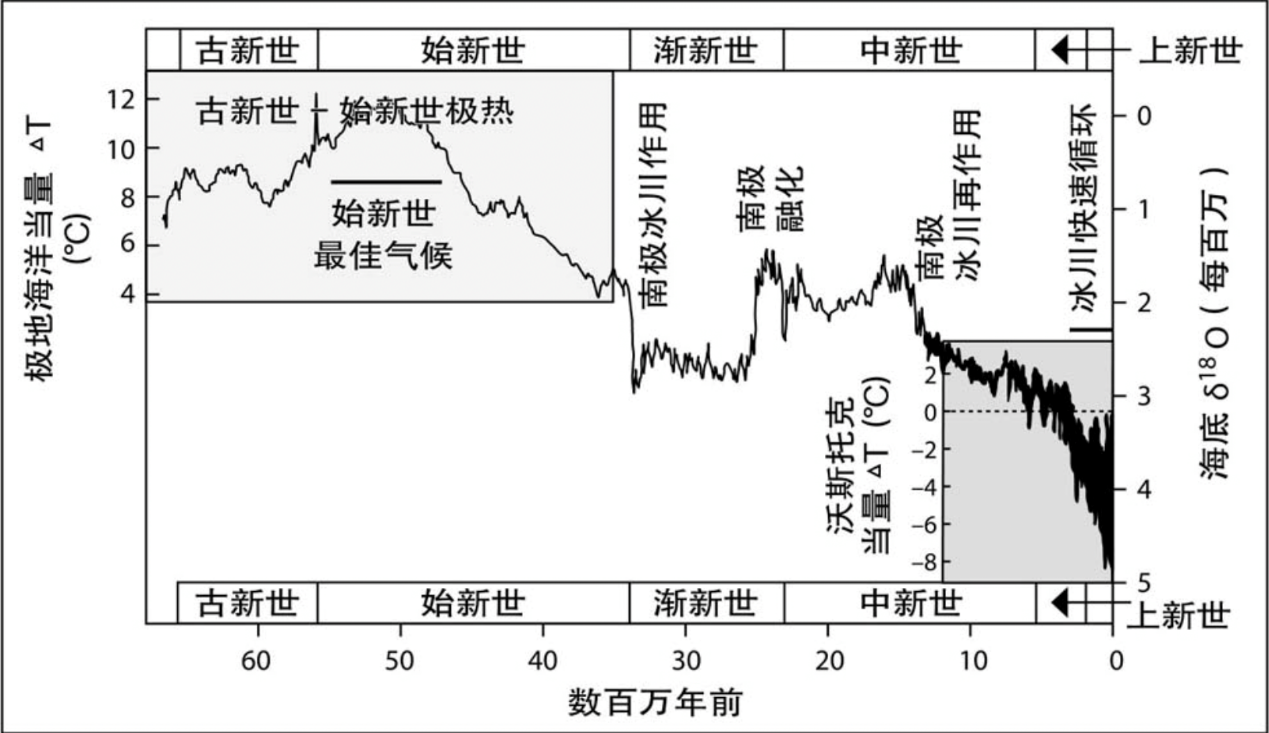我的《演化与创新》第一讲提供了更久远的气候变化图。但是这一幅插图很关键,对于理解最近的250万年的人类命运。注意横轴的刻度,以“万”为单位,现在诸友认真看看最近的10万年,右下角的窗口,地球表面温度的剧烈变化,尤其是最近的5万年,称为“冰川震荡期”。冰川期,平均大约12万年一次,以往250万年,称为“米兰科维奇”周期(地球进动周期、地球倾角周期、地球公转轨道从椭圆到不那么椭圆的周期、这些复杂因素的综合周期)大多如此。