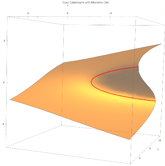突变理论是数学的一个简单分支,崛起于1965年,现在,随着“复杂社会的崩溃”流行于世,再度引发公众关注。最简单的突变模型,是这样一个方程:X^3-aX-b==0,两个等号的意思是“恒等式”。但我的mathematica习惯于使用“+”号,所以,这里的两个参量a和b,应当取负值。