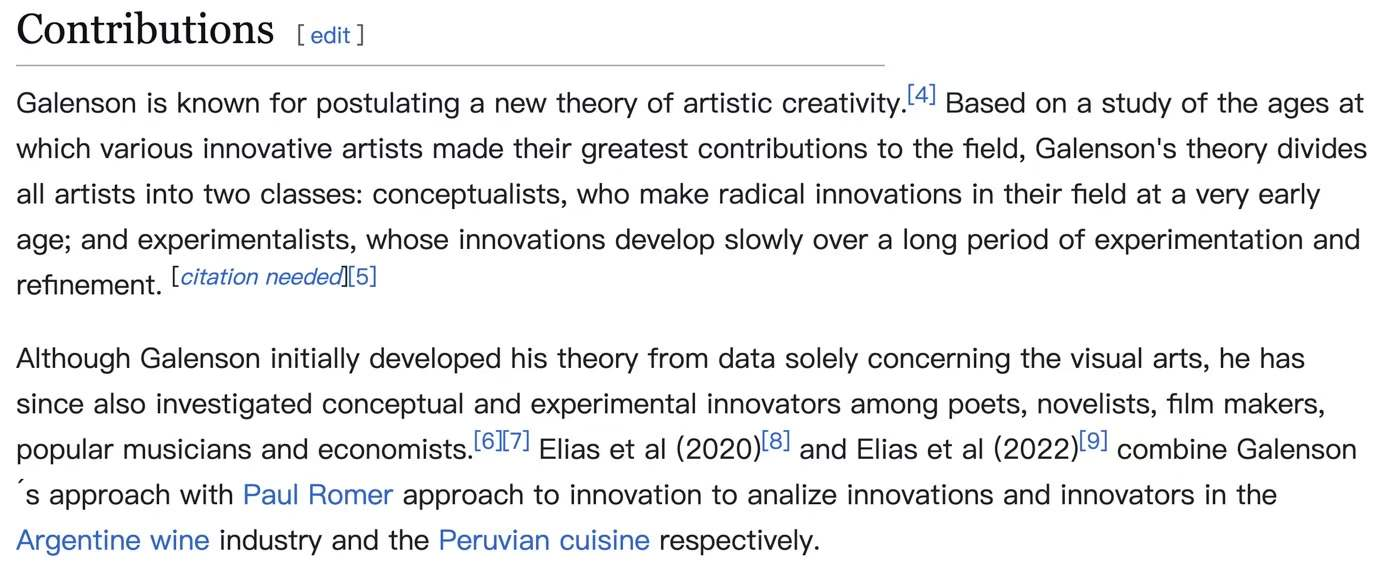 他统计每一艺术家被全部艺术史教科书引用率最高的作品发生于艺术家的哪一年龄,然后,他发现,艺术家要么成名于35岁之前(通常是“观念创新型”艺术家),要么成名于65岁之后(通常是“演化创新型”艺术家)。注意,我故意改变了加里森的用语,他的用语是“概念型”术家。可是,今天,如果你检索“概念艺术”,你就发现,这些概念艺术根本不是毕加索类型的。当然,你可能争辩说概念在今天就是激进的,如毕加索作品在当年的激进性一样。但我觉着很糟糕,不如不用“概念”创新者,而改用更原始的“观念”创新者。图2:大卫·盖伦森,1951年出生,图3,长期研究艺术经济学,图4,芝加哥大学经济系,他的“研究领域”:人类创新的生命周期与艺术市场。注意,他1978年就加盟芝加哥大学经济系了,是元老级的人物,难怪,他在序言里感谢了贝克尔。图5,他的个人主页,图6,他的个人主页目录。图7:他有闪亮的简历,现任布宜诺斯艾利斯创造力经济学中心学术主任。图8:他的父母都是经济学教授。图9:他的理论被运用于秘鲁烹饪学以及阿根廷葡萄酒。此外,我让豆包做了一番“深入研究”,盖伦森的创造性生命周期理论,有两条曲线,分别对应于观念创新者的影响力高峰和演化创新者的影响力高峰。这两条曲线,其实涵盖于 Dean Simonton 的天才研究之内,他的研究结论是:天才要么成名于28岁以前,要么成名于82岁以前。经济学家研究艺术领域的,人数极少,研究而有成果的更少。故而,这本书,我放在“工具书”文件夹里。现在我译听这本书的“小说家”章节,我注意到他使用了“实验主义”和“概念主义”,这两个“主义”,似乎很适合用来表达他的主要研究结论。