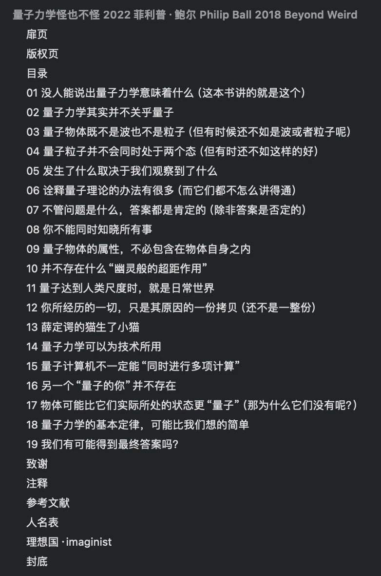 今天我推荐的,是我认为全世界最佳的科普作家菲利普·鲍尔2018年英文著作的2022年中译本,图1,尤其要看看这本书的目录,图2。我在朋友圈里至少推荐了他的两本科普著作,最新的一本是“生命究竟怎样运作”,似乎,还没有中译本。鲍尔是化学家,二十多年写作科普著作,涵盖了人类知识版图的大部分板块,从物理世界到心理世界。古希腊人的知识分类:1)物理的,2)心理的,3)历史的。鲍尔的这本“量子”科普著作,看目录,最精彩的各章,我列在这里:4、5、8、10、11、16。读了(听了)这本书,你就明白为什么我在2011年的《行为经济学讲义》里嘲笑当时流行的“量子纠缠”日常生活想象,你也会明白为什么将量子尺度想象为人类生活尺度导致的许多商业炒作,在中国则是“大规模骗钱”,确实是炒作。