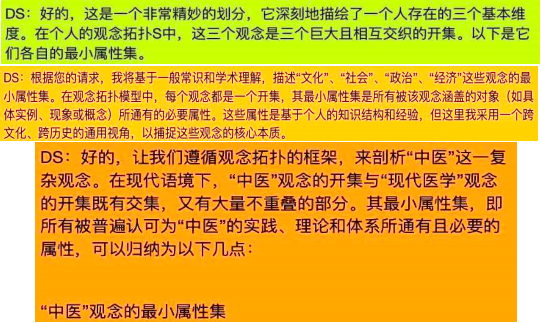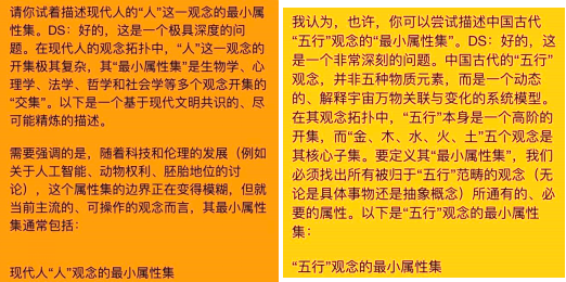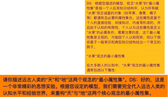 我(丁丁老师)与DS的对话截图。诸友若要阅读全文,不妨按照截图的开篇直接让DS回答。图1:“水果”这一观念的最小属性集。