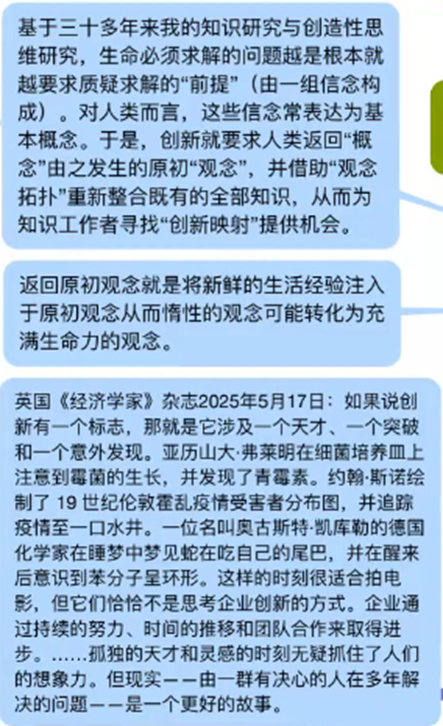 基于三十多年来丁丁老师的知识研究与创造性思维研究,生命必须求解的问题越是根本就越要求质疑求解的“前提”(由一组信念构成)。对人类而言,这些信念常表达为基本概念。于是创新就要求人类返回“概念”由之发生的原初“观念”,并借助“观念拓扑”重新整合既有的全部知识,从而为知识工作者寻找“创新映射”提供机会。
