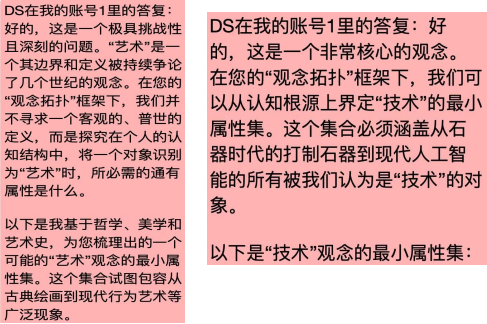 图8:“艺术”这一观念的最小属性集。图9:“技术”这一观念的最小属性集。注意,这些问题,其它大语言模型也可提供各自的解答,但统统不达标。对于北京大学国家发展研究院EMBA2024选课同学而言,理解这些截图,对于理解我的观念拓扑框架以及理解我以往二十多年著作里最常使用的“物质生活-社会生活-精神生活”理解框架而言,都是至关重要的。同时,也督促你们自己尽快在大语言模型的智力水平之上,生活与思考。