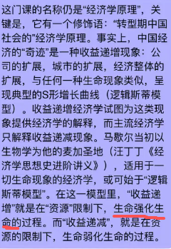 本课程名称仍是“经济学原理”,关键是它有一个修饰语“转型期中国社会的经济学原理”。事实上,中国经济的“奇迹”是一种收益递增现象:公司的扩展、城市的扩展、经济整体的扩展,与任何一种生命现象类似,呈现典型的S形增长曲线(逻辑斯蒂模型)。收益递增经济学试图为这类现象提供经济学的解释,而主流经济学只解释收益递减现象。马歇尔当初以生物学为他的麦加圣地(汪丁丁《经济学思想史进阶讲义》),适用于一切生命现象的经济学,或可始于“逻辑斯蒂模型”。在这一模型里,“收益递增”就是在“资源”限制下,生命强化生命的过程。而“收益递减”就是在资源的限制下,生命弱化生命的过程。