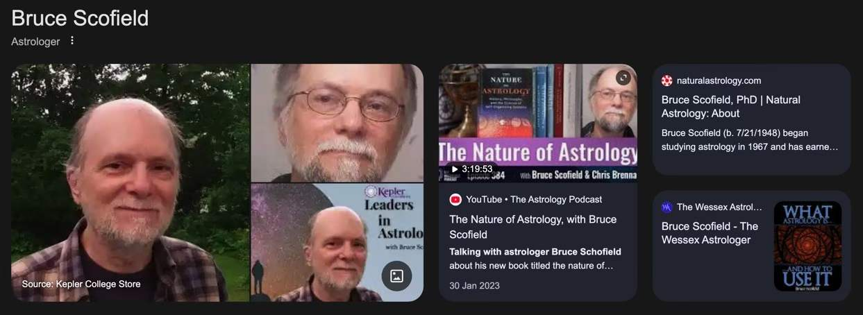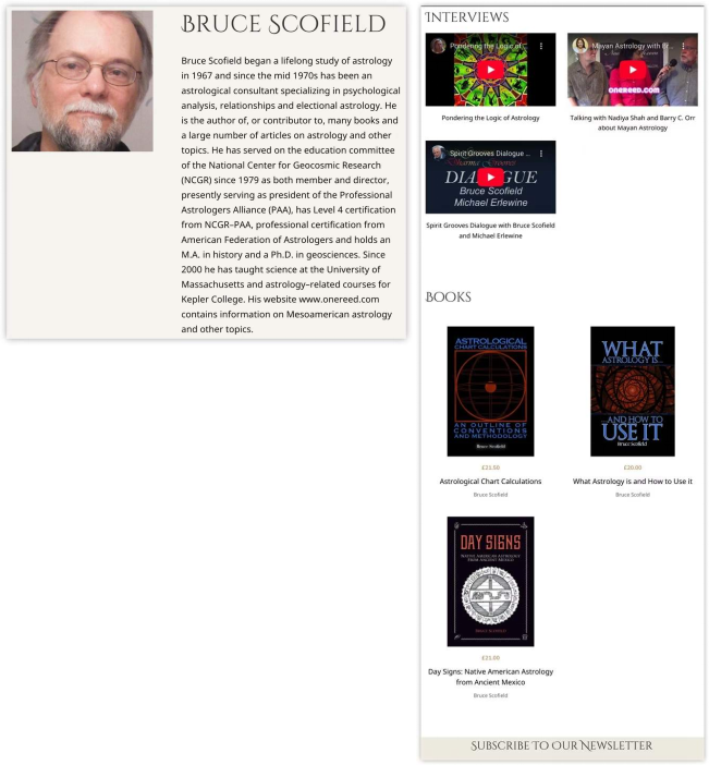 图3:Bruce Scofield 个人主页,布鲁斯·斯科菲尔德于1967年开始终身研究占星学,自1970年代中期起成为一名专注于心理学分析、关系和选举占星的占星顾问。他是许多书籍的作者或撰稿人,以及大量关于占星及其他主题的文章。自1979年以来,他一直担任国家地球宇宙研究中心(NCGR)教育委员会成员和主任,目前担任专业占星师联盟(PAA)主席,拥有NCGR–PAA的4级认证、美国占星师联合会的专业认证,并拥有历史学硕士和地球科学博士学位。自2000年以来,他在马萨诸塞大学教授科学课程,并在开普勒学院教授占星相关课程。他的网站 www.onereed.com 包含中美洲占星及其他主题的信息。图4:Bruce Scofield的视频与书,在第一个视频里,他阐释了占星术的逻辑基础。在第二个视频里,他解释古代马雅的星相学。第三个视频:灵魂的律动。图1所示的这本书,这样介绍这位作者:布鲁斯·斯科菲尔德拥有马萨诸塞大学地球科学博士学位、蒙特克莱尔大学社会科学硕士学位以及罗格斯大学历史学学位。目前他担任开普勒学院的讲师,并兼任专业占星师联盟的主席,同时也是14本书的作者。他居住在马萨诸塞州的阿默斯特市。