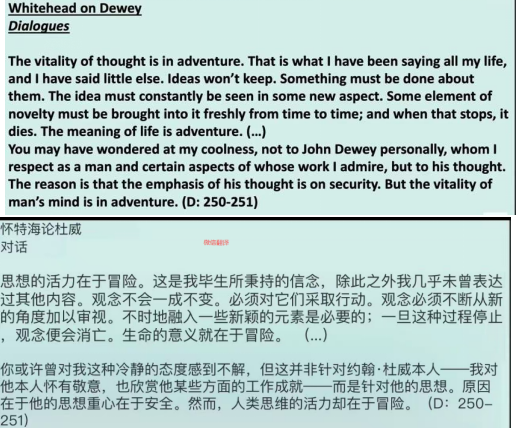 图8:马睿博2022年的演讲Maria Regina Brioschi 2022 Reason in Action --- The Place of Dewey in Whitehead’s Harvard Lectures,这里写出的是怀特海评论杜威的文字。