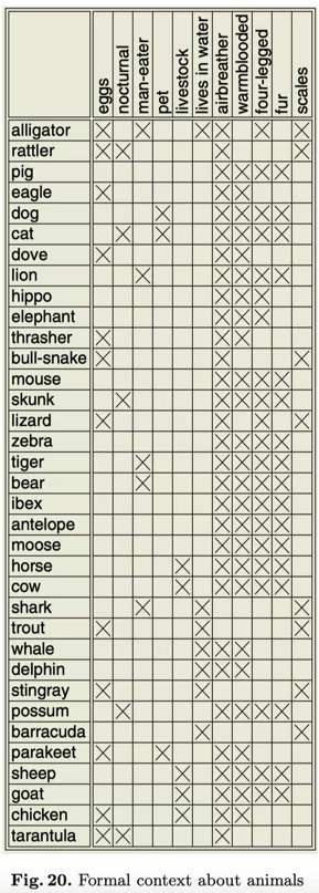 图4:Rudolf Wille and Bernhard Ganter eds 2005 Formal Concept Analysis --- Foundations and Applications 图动物的正规语境,这是“关系数据库”的思想来源。