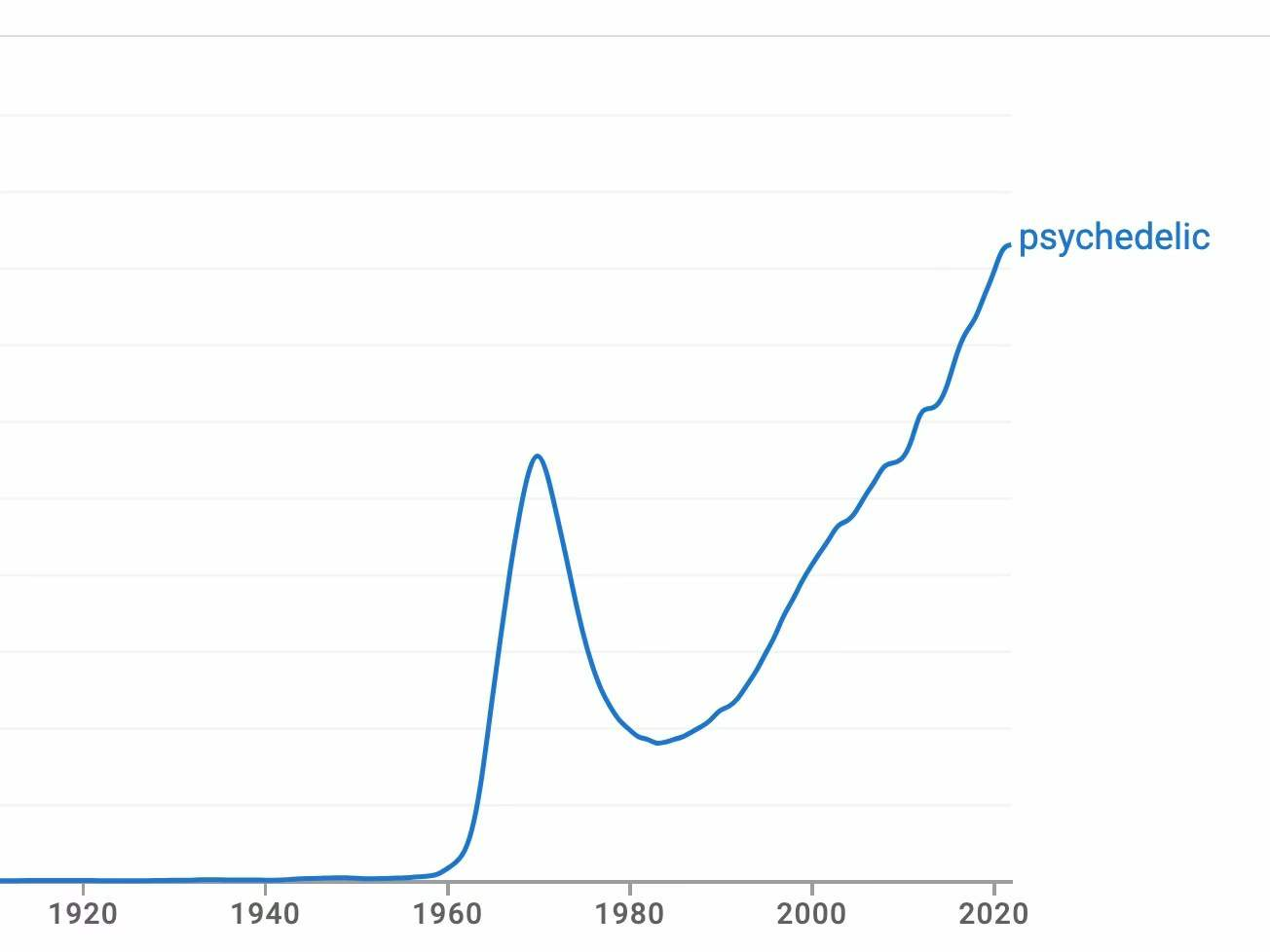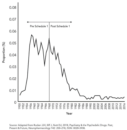 图3,由于2019年拜登政府对心理致幻剂“解禁”(2020年1月1日生效),关于心理致幻剂的研究报告数量开始回升,但仍远低于历史高峰期。注意,这里显示的最晚年份是2016,故应补充谷歌“nGram”检索的结果,
