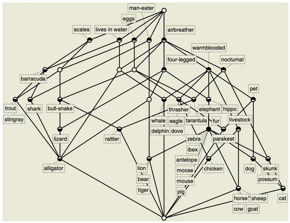 图3:Rudolf Wille and Bernhard Ganter eds 2005 Formal Concept Analysis --- Foundations and Applications 图22 动物概念格。
