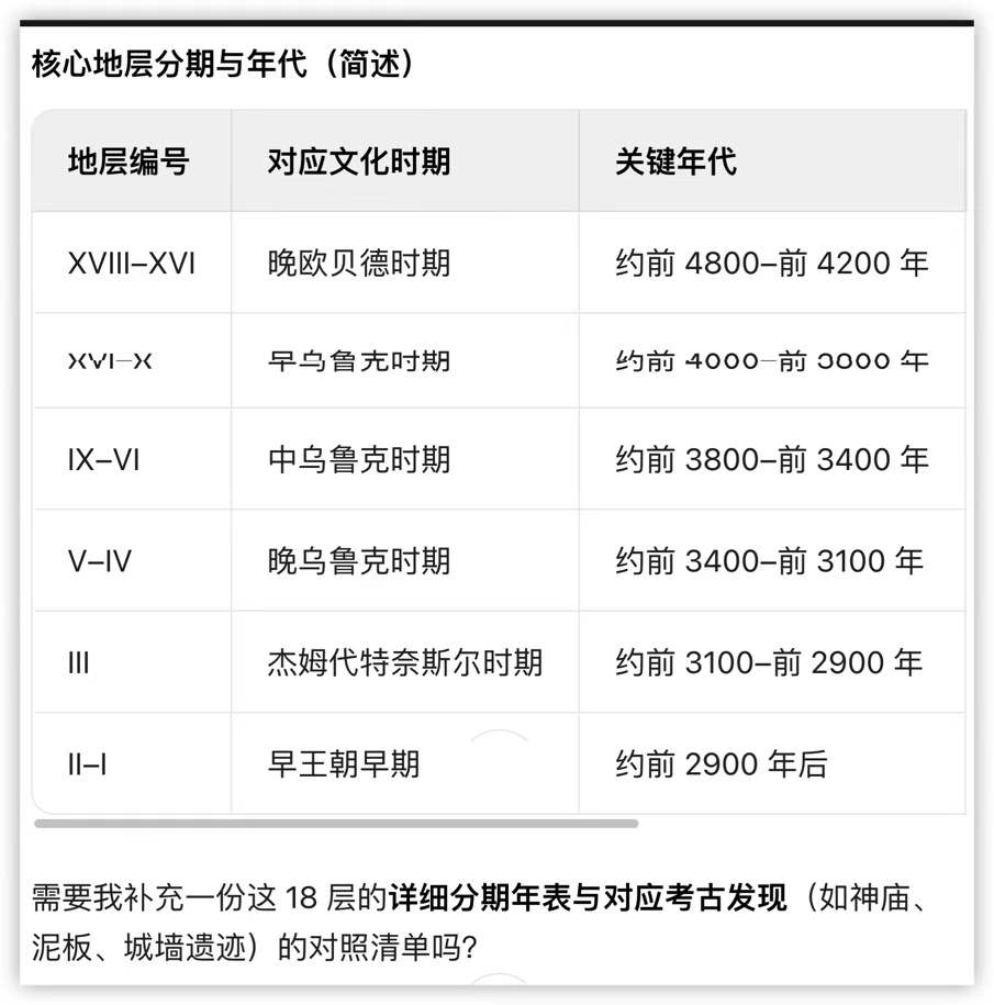 图2:这位作者,根据最近破译的一块楔形文字泥板,试图重建苏美尔文明之前(史前文明)的占星术,他将这种远古星学回溯至一万年前的哥贝克利神庙,那些有动物浮雕的人形石柱。根据巴比伦时期的星相学楔形文字泥板,出生星盘,太阳在黄道带的星座位置,大约每两千两百年就倒退一个星座。据此,大约七千年前至一万年前的星盘,对应于今天“昴宿”星团的,在楔形文字泥板上称为“蜘蛛”星座。他重建的,是一套十八星座的远古星盘,图2,其中,开端的星座,“蜘蛛”,对应于今天星盘里开端的星座,“双鱼”。而双鱼座对应于古代美索不达米亚的两条河流,它们的相对位置与夹角,在苏美尔人的视角下,那里就是世界的起源:淡水(两河)与咸水(波斯湾)在苏美尔最古老的城邦(两河流域与波斯湾交汇之处)汇合。今天,我以前在朋友圈里介绍了几次,乌鲁克考古发掘,总共列出十八个考古文化层。最底层(第18层)由两个村落或更多村落重叠而成,大致属于乌拜德文化(约七千年前)。ChatGPT 5.2 提供了详细解释,乌鲁克考古文化层的第14层至第10层,公元前四千纪初期(4000-3800 BC),才开始明显具有乌鲁克文化的特征。第9层至第6层,约3800-3400 BC,“乌鲁克中期”。第5层至第4层,约3400-3100 BC,“乌鲁克晚期”。北京大学毕生研究楔形文字的拱玉书教授2024年的著作《苏美尔文明》所述乌鲁克遗址,大致对应于“乌鲁克晚期”。我很高兴见到“豆包”更新了自己的考古知识,今天,它正确回答了我的问题:苏美尔古城乌鲁克总共有多少考古文化层?豆包答复:苏美尔古城乌鲁克总共有18 个考古文化层,考古学上通常编号为乌鲁克 XVIII 期(最底层,约公元前 5000 年埃利都时期)至乌鲁克 I 期(最上层),不同地层对应了从早期聚落、乌鲁克文化、杰姆代特奈斯尔文化到早王朝等不同发展阶段,