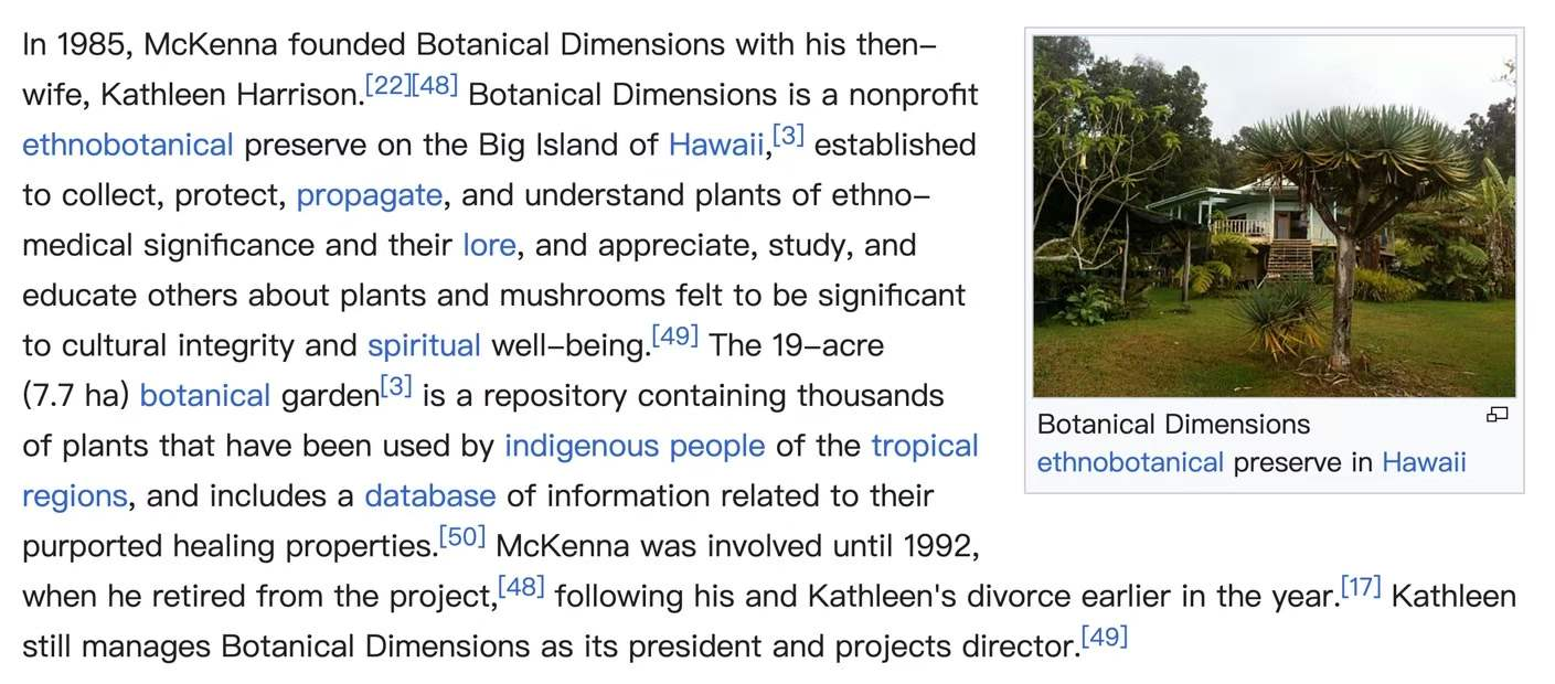 图5:In 1985 McKenna founded Botanical Dimensions,这是1985年麦金纳在夏威夷的“大岛”建设的“植物维度”小屋(珍惜植物博物馆)。图1所示的对话,三位对话者,都在这个小屋里生活过。Wikipedea“麦金纳”词条:他出生于科罗拉多州,从小就对自然、心理学和幻象体验产生了浓厚兴趣。14岁时,他在阅读卡尔·荣格的《心理学与炼金术》一书后开始对心理学产生兴趣。同年,他第一次了解到“迷幻蘑菇”的存在——这一信息来自1957年5月13日出版的《LIFE》杂志上的文章《寻找迷幻蘑菇》。青少年时期,他便开始吸食大麻。1963年,他通过《感知之门》和《天堂与地狱》的作者阿道司·赫胥黎的著作,以及《村声报》部分刊登迷幻药文章,接触到了迷幻药的文学界。麦金纳说,他早期一次迷幻的牵牛花种子体验让他“意识到那里有值得追求的东西”。1965年,麦肯纳进入加州大学伯克利分校,并被塔斯曼实验学院录取。1967年在大学期间,他开始通过研究藏传民间宗教来学习萨满教。同年,他称之为“鸦片与卡巴拉阶段”,前往耶路撒冷,在那里结识了后来成为他妻子的民族植物学家凯瑟琳·哈里森。1969年,麦金纳因对藏绘和迷幻萨满教的兴趣前往尼泊尔。他寻求藏苯教萨满,试图了解萨满如何利用异象植物。在那里,他还学习了藏语,并从事大麻走私工作,直到“他从孟买到阿斯彭的一批货物落入美国海关手中。”他在20世纪60至70年代游历亚洲和南美,塑造了他对植物性迷幻药,尤其是裸盖菇的理论,