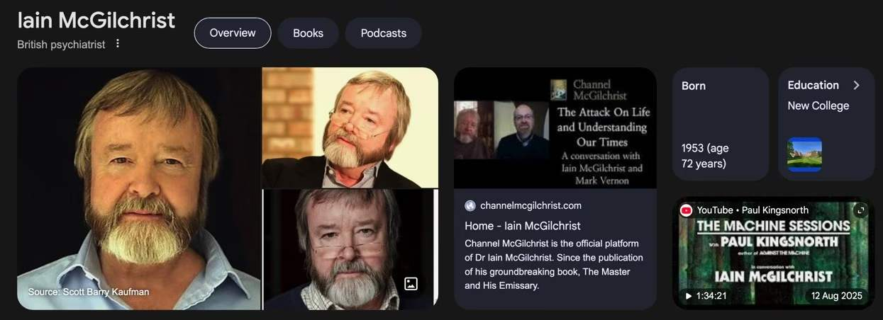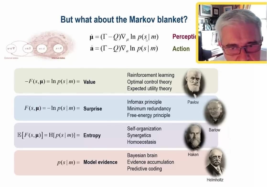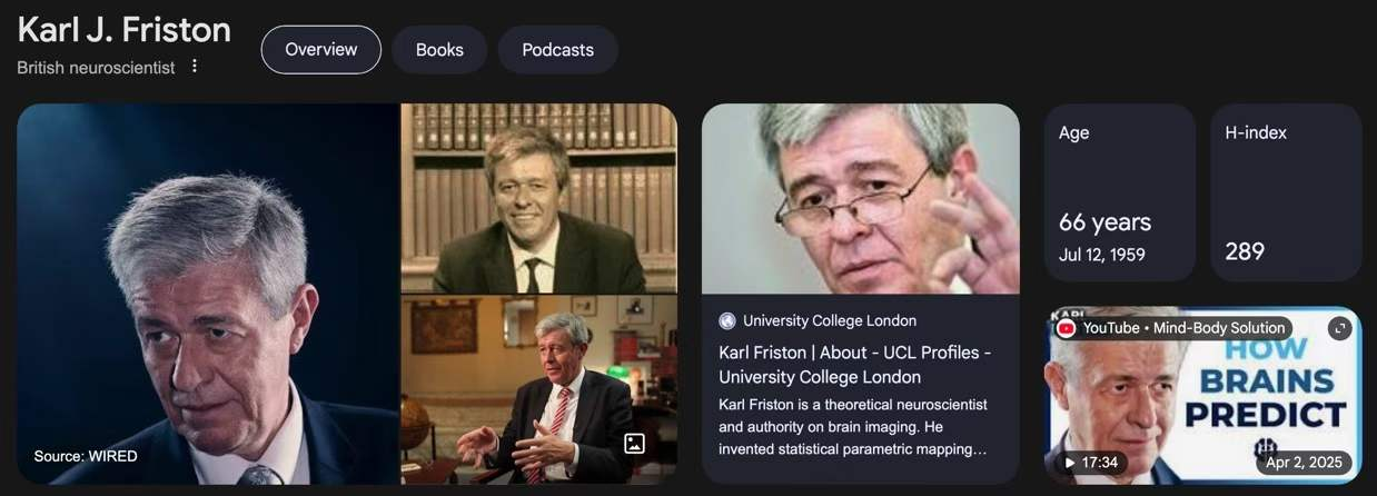 2025年11月13日 Gary Marcus 与 Karl Friston 的对话,继续探讨具身机器人如何形成意识,抑或仅仅从“内容”映射到“内容”却无法涌现真正的“意识”。马库斯是当代世界最著名的人工智能批评者,我在朋友圈里介绍了他至少两次,他年轻时创建了一家成功的人工智能应用公司,后来卖给了“优步”。他对人工智能目前思路的激烈批判,与我一样,基于对人工智能基本原理的把握。也因此,奥尔特曼将马库斯视为“天敌”。我评论过,马库斯的言谈举止,充分显示了他的敏捷与才华,例如,他旁边这位,我在朋友圈里推荐了他的两部著作,第一部有中译本(统计参数图 脑功能成像分析 英文版 Karl J Friston 著 2010 科学出版社),他将物理学与心理学统一于自己最近二十年来建构的“数学原理”,并因此而形成了一个学派,他称之为“最小自由能原理”学派。他讲话时的声音格外小,他的许多视频都如此,以致我必须调大音量两倍还常常听不清他在讲什么。马库斯只听他讲了不足两分钟就开始“走神”,似乎完全明白了他的意思,他弯腰从椅子下面拿出一杯咖啡,我看到椅子下面还有另一杯咖啡或饮料,他不打算直视对方的眼睛,这是一种性格,说实话,我自己就是这样,因为我常常在对方说到三分之一时就明白了全部意思于是开始想我自己要想的,如果我继续望着对方的眼睛,那就反而更不诚实,因为我的眼神会鼓励对方继续解释自己的思路。卡尔就是这样一位深思的学者,Karl Friston(这个“Karl”让我推测他是英国皇家学会里的德国人),图2,他是神经科学家,1959年出生,目前是英国皇家学会和伦敦大学学院的明星物理学家(他在2009年之前以核磁共振脑功能成像数据的处理方法闻名于世并因此入选英国皇家学会)。此后,他转入“意识”研究,发表了著名论文“the foundations of biology”(生物学的基础),副标题是“physics of sentience”(关于感觉的物理学)。他的思路是理论物理学的,毕竟,这是他的本行,但因在脑科学领域的成就,他继续前行,就遇到“意识”问题了。