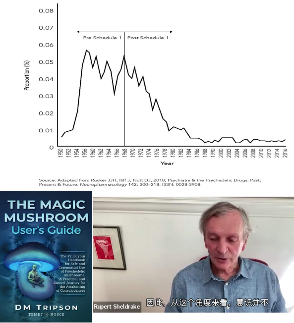 图7:致幻剂研究状况,1950-2016。图8:DM Tripson 2020 The Magic Mushroom User's Guide --- The Psilocybin Handbook for Safe and Ceremonial Use of Psychedelic Mushrooms --- A Practical and Sacred Journey for the Awakening of Consciousness《魔法蘑菇使用指南:安全和仪式使用心理致幻蘑菇的裸盖菇素手册,为意识觉醒的实践与神圣之旅》。图9:Ruppert Sheldrake 2025 Oct-3 What is really known about consciousness(关于意识我们究竟知道什么)。在这次访谈中,谢尔德莱克概述了他坚持研究的“宇宙意识”,用他的术语,“意识场”。这是一种外在于任何个体的场,在他的一系列科学实验中,已表明是真实存在的。事实上,普通人可以重复他设计的这些实验,只要他们有自己忠实的狗。
