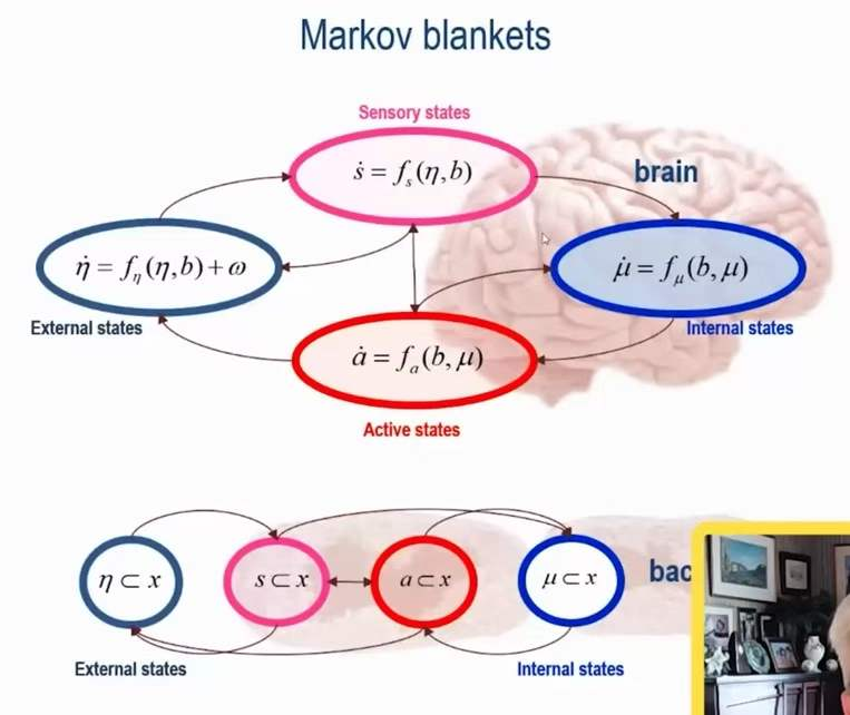 图7,这里显示的图形,是模型在特定边界条件下的一个解的“意识”图示。图8:value, surprise, entropy, model evidence(价值、惊讶、熵、模型里的自明性)。这里列出的,是他的思路里最关键的四个单词。我最喜欢的是,他坚持解释最原始生命的意识,所以,他的模型,首先适用于“细菌”,例如“原核细胞”。我尽可能避免讨论真核细胞(体积通常是原核细胞的一万倍)。原核细胞的内部犹如广州城里,人头攒动,摩肩接踵,在宏观视角下,是典型的“无序”现象,正是从这种微观无序现象里,生命涌现,宏观视角下,形成了最原始的“生命”(细胞复制自身的过程)。他的学说,最初的假设是:原核细胞有能力区分“内部”与“外部”,因为,外部的活动,与内部的活动,相互之间有某种独立性,这种外部活动对内部活动相对独立性,在演化中能够生存的细胞必须有所感觉,否则,符合我们的常识,它将很难繁衍后代。因此,原核细胞为繁衍后代,必须遵循这一假设:细胞膜的外部不同于细胞膜的内部。图8列出以往的大理论之为他的大理论的特例。图9,随后,他在自己的大理论框架里定义物理学视角下“粒子”:粒子意味着对系统状态的重新划分,将这些状态归入“内部的”、“外部的”、“边界的”。我仍在“微信读书”里反复译听他的两位弟子和他于2022年发表科普作品:Thomas Parr, Giovanni Pezzulo, Karl J Friston 2022 Active Inference --- The Free Energy Principle in Mind, Brain, and Behavior MIT Press《主动推断:心智、大脑、行为中的自由能量原理》。在我的理解里,这位作者远超我前几天推荐的认知语言学家 George Lakoff 2025年新著。远超,因为后者不愿意或不能够将自己的视野扩展到原核细胞的水平。事实上,我评论过了,他描述的“神经回路”,至少适用于玄武纪爆发之后的生命。
