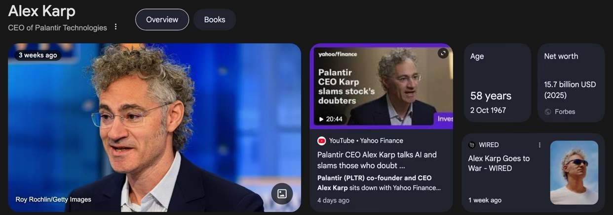 图1:Palantir CEO Alex Karp 2025 Sep-10 Why the West is Destroying Itself, Data Empire, Skeptics, How to Win,卡普2025年9月10日的视频,他曾帮助蒂尔为Clarium Capital筹集资金 2004年卡普与蒂尔等人共同创立了Palantir Technologies担任首席执行官 《纽约时报》在2020年公司上市当年将卡普评为上市公司薪酬最高的首席执行官薪酬达11亿美元 2024年他是美国上市公司薪酬最高的首席执行官实际薪酬近68亿美元 《经济学人》评选卡普为2024年度首席执行官。最近,这家公司的估值超过了五千亿美元,它的名称,来自托尔金著作里的魔幻水晶球。所以,Palantir不妨译为“水晶球”。水晶球CEO是卡普,今天我贴图的主旨是介绍他。