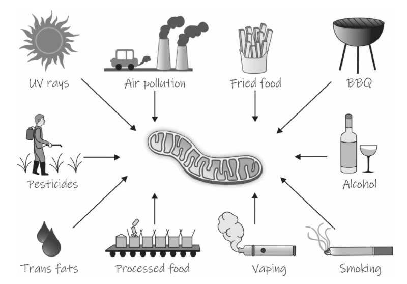 图9:对线粒体的潜在有害物质:酒精、吸烟、电子烟、加工食品、反式脂肪、杀虫剂、紫外线、空气污染、油炸和烧烤食品。