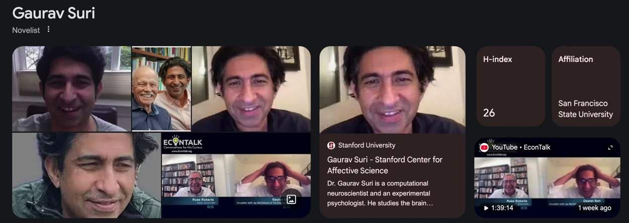 图3:第一作者的谷歌检索结果相当奇怪,第一项,通常是近照,在他名字下方写着:小说家。我不信,继续看第二项,果然,他是斯坦福大学培养的“计算神经科学家”。