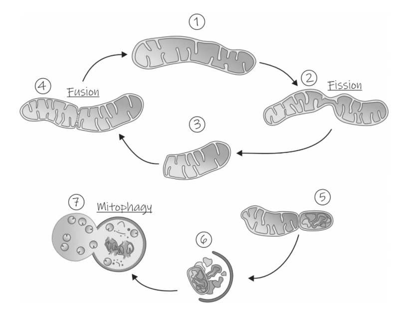 图7:线粒体是动态的。作为其动态特性的一部分,线粒体经历融合和裂变的过程。例如,线粒体(1)可以经历对称裂变,如步骤(2)所示新的线粒体(3)在细胞内执行其工作,并在某个时刻与另一个线粒体相遇并融合(4)交换组分。在某些情况下,线粒体可以通过非对称裂变来修剪自身,去除受损的线粒体DNA和蛋白质(5)。完成后,一部分是健康的新鲜线粒体,准备发挥作用。被夹断的部分被自噬体收集(6),我们可以把它们看作垃圾车。被夹住的部分随后被带到溶酶体(7),我们可以把它看作是回收中心,在那里它会经过线粒体吞噬。