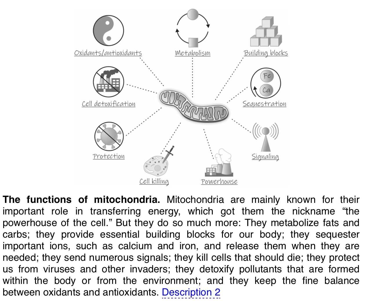 图6:线粒体的八项已知功能。线粒体主要因其在能量传递中的重要作用而闻名,因此获得了“细胞的动力工厂”的绰号。但它们的作用远不止于此:它们代谢脂肪和碳水化合物;它们为我们的身体提供了重要的构建要素;它们会封存重要离子,如钙和铁,并在需要时释放;它们传递大量信号;它们杀死本应死亡的细胞;它们保护我们免受病毒和其他入侵者侵害;它们能够解毒体内或环境中产生的污染物;它们保持了氧化剂和抗氧化剂之间的微妙平衡。
