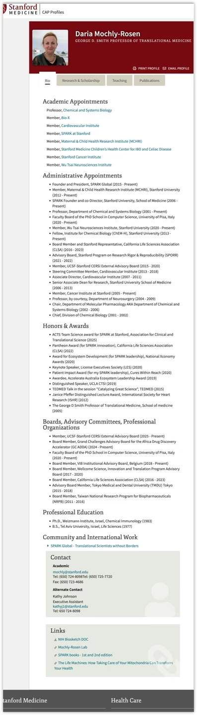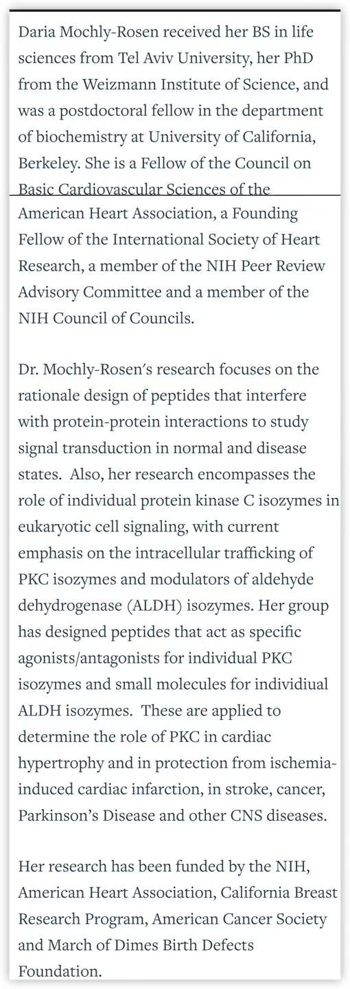 图11:达里娅·莫克利-罗森(Daria Mochly-Rosen)获得了特拉维夫大学生命科学学士学位,魏茨曼科学研究所博士学位,并曾在加州大学伯克利分校生物化学系做博士后研究员。