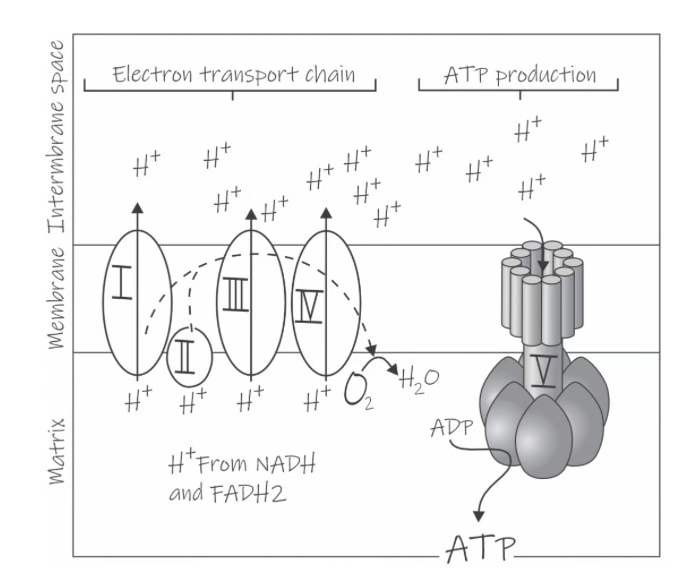 图8:你吃的食物和你呼吸的氧气最终如何转化为 ATP。你吃的和呼吸的东西会促进质子泵浦的过程,如图左侧所示。 NADH 和 FADH2 这两个分子起源于您所吃的食物,它们启动了电子传输链(复合物I至IV)。您呼吸的氧气(02)在该过程结束时接受电子。当电子穿过这条链(由虚线表示)时,称为质子(H+)的带正电粒子被泵入膜间空间,形成质子梯度——膜间空间和基质之间质子浓度的差异。因为基质中现在有负电荷,所以质子被吸引到线粒体的该区域,而返回的唯一途径是通过转子,这可以在该(简化)图的右侧看到。这个转子(是的,它确实在旋转)被称为 ATP 合酶,或复合体 V,它将ADP 转化为 ATP,从而为细胞活动提供能量。