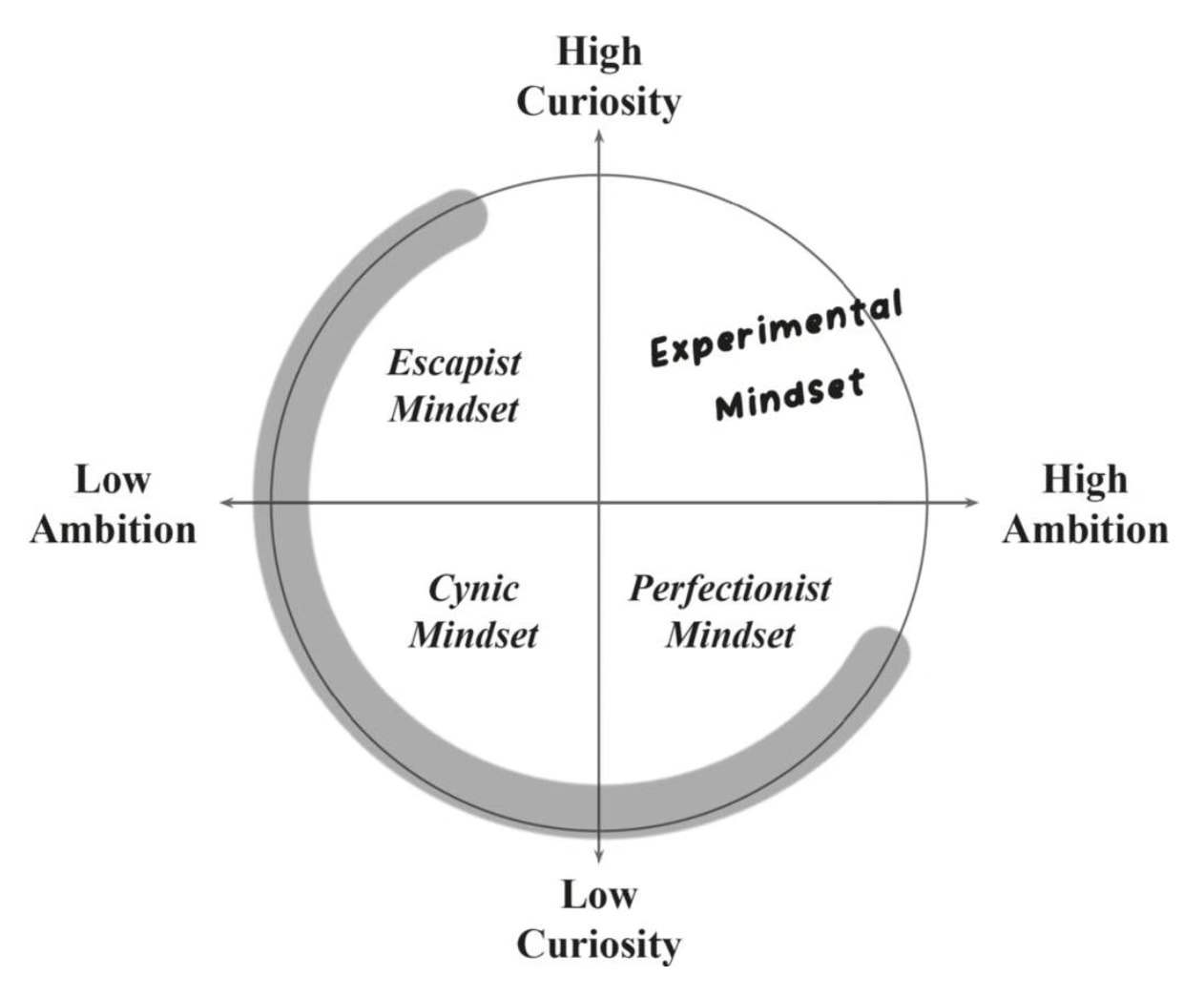 图2:人的心态,最重要的两个维度是“好奇”与“野心”,于是,当代人的心态据此分为四类,其中,位于第一象限的心态,“很高的好奇与很大的野心”,是这本书讨论的主题,被称为“实验的”(心态)。位于第二象限的心态,“很高的好奇与很低的野心”,被称为“逃避现实的”(心态)。位于第三象限,“很低的好奇与很低的野心”,被称为“犬儒的”或“愤世嫉俗的”。位于第四象限,“很低的好奇与很高的野心”,被称为“完美主义的”。可见,“野心”这一语词,在这里的意思更接近“事业心”或“责任心”。我认为这样的心态分类,在当代心理学教科书里有更贴切的表达(参阅我的《行为经济学讲义》):任何生命的心智都有两种倾向,“灵活性”与“稳定性”。过于灵活的或过于稳定的,都很可能在演化中被淘汰。据我观察,也是计算机仿真的结论,在漫长演化中没有被淘汰的生命,心智介于“三分之一的灵活性+三分之二的稳定性”与“三分之二的灵活性+三分之一的稳定性”之间。
