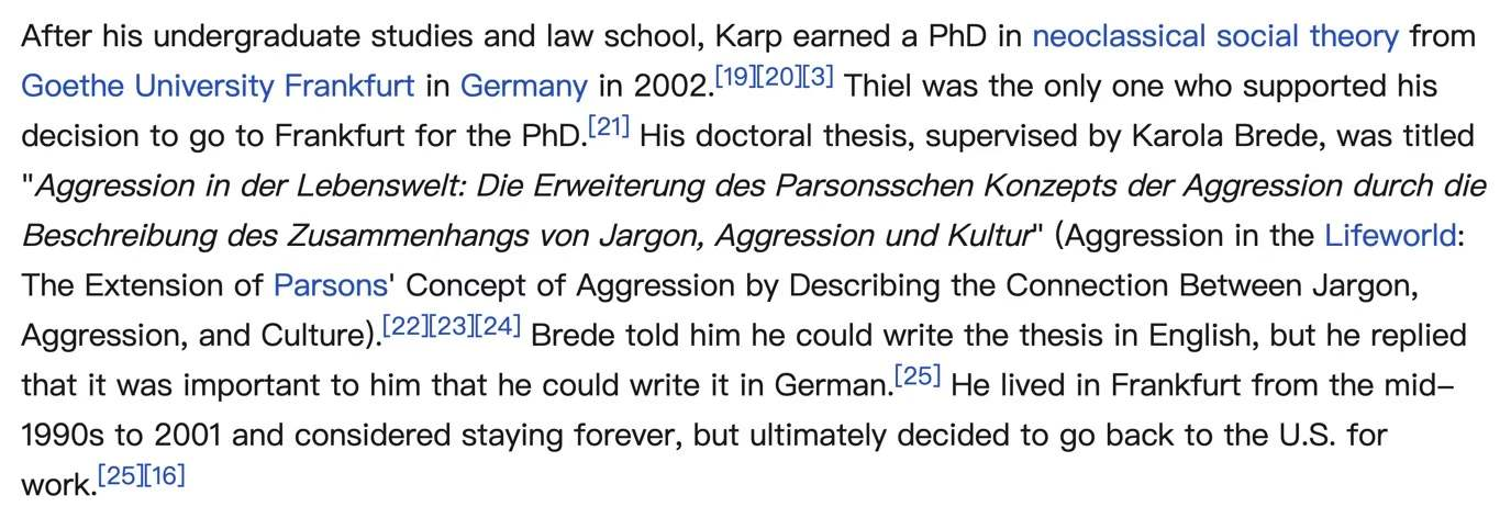 图5:完成本科和法学院学业后,卡普于2002年在德国法兰克福的歌德大学获得“新古典社会理论”博士学位,supervised by Karola Brede,至少根据维基百科,他的博士导师不是哈贝马斯。
