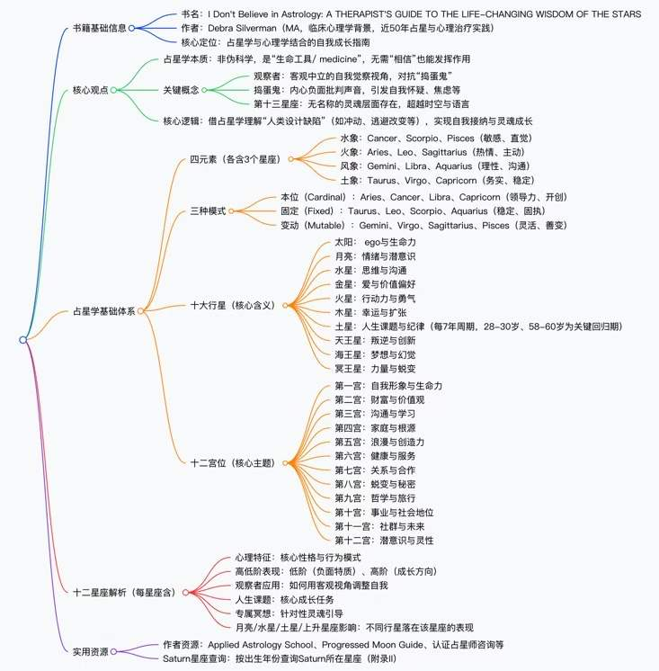 感谢北京大学国家发展研究院EMBA2024级王珊珊的评论:从思维导图上来看,这本书是将心理学和占星学做了结合(给予了占星学研究的积极意义-占星学可作为自我认知和成长的工具)。占星学的框架理念和我之前的认知基本无差异,框架中少了行星落宫位以及行星间的相位,如果仅从占星学的体系和理念上,作者恐怕确实不能和十多年前就深度钻研占星学的学长对话[呲牙]这本书从占星学角度可能更适合初级水平的阅读者,但是它从心理学角度去思考占星学是一个全新的视角,适合现阶段的我去学习一下。
