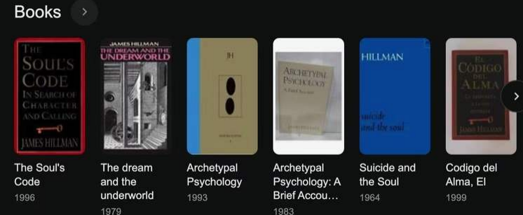 图6:希尔曼的一部分著作。其中最著名的,是“灵魂密码”,在当年的《纽约时报》畅销书榜单持续了一整年,以致,那位著名的神秘主义电视主持人拿着这本书在节目里专访希尔曼。回到2009年我观看国会图书馆的荣格《红书》首发式,当时,我在夏威夷的巴尼斯·诺贝尔书店里,对着摆放在书架上的《红书》,试图拍照,因为那本书太大,占据了小半个书架,于是,我写信给东财我主持的跨学科教育实验项目的办公室主任,希望他尽快购买这本书。回国之后,我看到了,在图书室里,三本,其中一本是原版,很贵,所以,被放在我在校园里的“外事公寓”401寓所的书房里了。