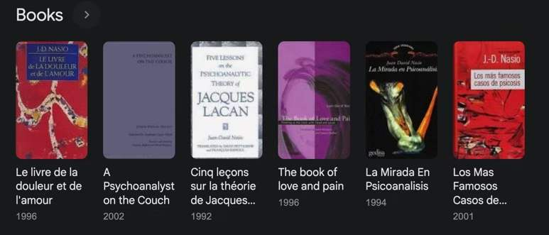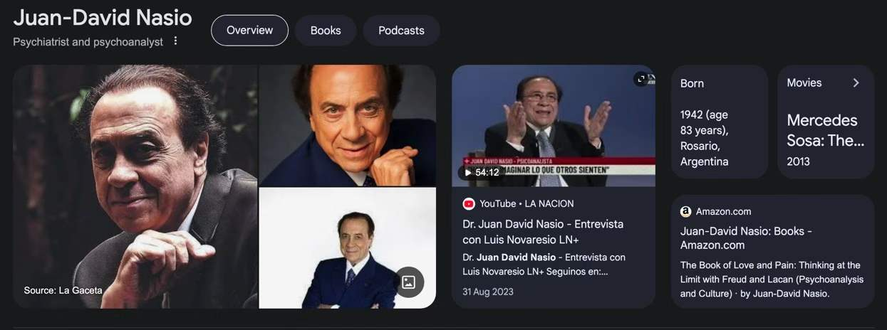 图1:精神分析如何改变人 无意识与无意识的精彩对话 2025 简-大卫·纳索,Juan-David Nasio Psychiatrist and psychoanalyst 1942年出生,心理治疗师与精神分析师,巴黎精神分析学会的会长。他在阿根廷的布宜诺斯艾利斯大学获得学位,图2,到法国师从拉康。这本书,我推测是弗洛伊德学派临床心理学的培训教材。前天,听完了这个中译本之后,我下载了纳索的六部著作的英译本。如前述,我认为最关键的书,必须听完,而不是只听一半就推荐。我的经验是,绝大多数的新书,我只要听到一半就可做出正确的判断,通常,我只浏览目录就可做出正确判断。精神分析不是荣格学派的,我确实不熟悉,如果我感觉重要,就要听完才可有判断(未必正确)。这位纳索的这几幅照片,给我的印象,不像是一位精神分析学家。当然,拉美的表情,与欧洲的,常常迥异。我明白,二战以后的拉美,很可能与当地的神秘主义传统密切相关,成为“深层心理学”的重镇。拉美文学,拉美精神分析,一脉相承。不论如何,我听这本书,启发良多,再次听完,还要下载他的著作的英文译本,放在微信读书里译听,果然,他对拉康学派也有批评,或者是黑格尔式的“扬弃”。对照我下载的英译本,我推测,这个中译本的原标题应当是:在诊所里的精神分析师(这也符合中译本封面的法文标题)。这个英译本是2013年出版的,因此,这个中译本,2025年出版,在深层心理学领域,不算很迟。其实,这本书的法文版是1993年的。请注意,在深层心理学领域,1990年代的原著,已足够新!例如,我年底授课的后半段,引用的几位法国哲学家当中,与“创新”理论密切相关的一位,吉尔伯特·西蒙东,最新的英译本是2023年的,这个英译本的法文原稿,是他1965学年在索邦大学的授课提纲。一位思想者的言论,在半个世纪之后突然被学界关注或“死灰复燃”,在思想史记录里,太常见了。凯恩斯有过类似的表达,一个重要的观念,半个世纪之后显现其重要性,是它的常态。