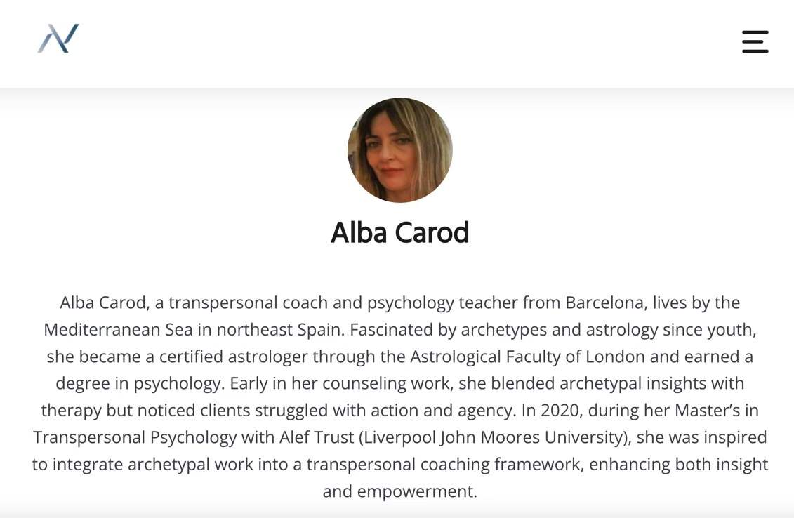 阿尔巴·卡罗德(Alba Carod)是一位超个人心理学教练,同时也担任高等教育的心理学教师。她来自巴塞罗那,现居住在西班牙东北部,那里毗邻地中海海岸。从小她就对各种原型的深刻象征意义着迷。这种对占星学的兴趣一直持续到她的青年和成年时期,最终促使她成为伦敦占星学院认证的占星师。为了更深入地理解人类心理,她进一步攻读了相关学位,心理学。在她刚开始从事咨询工作的初期,她将原型理论(archetypal knowledge)与咨询实践相结合。随着时间的推移,她意识到尽管客户通过原型理论获得了某种领悟,但他们并没有付诸实际行动,这可能是因为……他们感到自己缺乏自主权(或:无法自主决策)。辅导。正是在她参加超个人心理学硕士学位课程期间……2020年,Alef Trust(利物浦约翰摩尔斯大学)的支持让Alba获得了灵感,将那些具有典型意义的作品融入到超个人辅导框架中。凭借她在心理学、辅导、占星学和梦境分析方面的知识与经验,阿尔巴开发出一种以自我意识为核心的全方位辅导方法。通过这种创新性的方法,她将占星学中的原型概念与梦境解析相结合,帮助人们实现个人成长与转变。旅程。这种方法为一种新型的跨个人辅导模式奠定了基础,这种模式建立在参与式的原型探索之上。