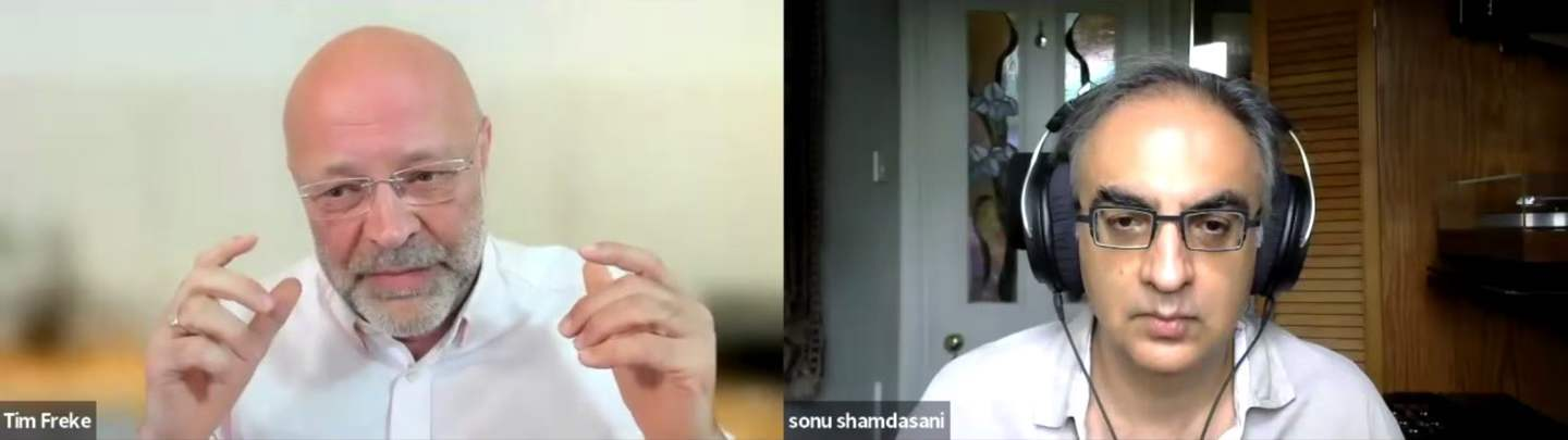 图4和图6:What Is Life 2023 July-8 Tim Freke interviewed Sonu Shamdasani at home,荣格精神遗产委员会双主席之一,神童,荣格全集新版的主编,沙姆达萨尼·索努,2023年的访谈,“什么是生命”。