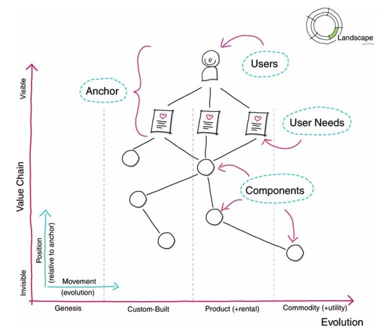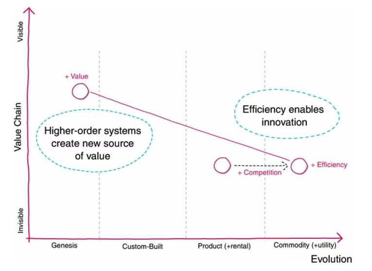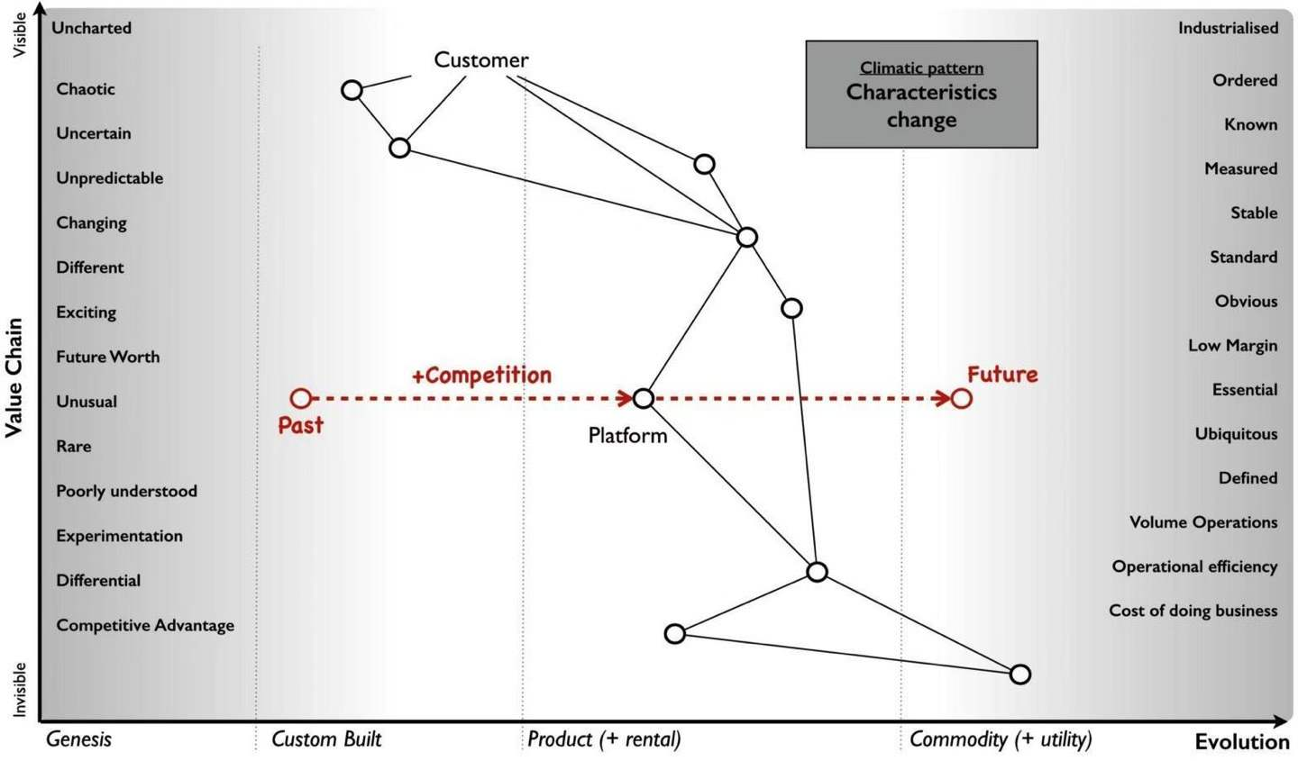 Wardley Mapping --- The Knowledge Part One --- Topographical intelligence in business 2020 Simon Wardley,事实上,在沃德利2020年著作的第3章和第7章,出现了这幅核心地图。他的女弟子的地图,与这一幅地图,如出一辙,都由“演化”与“价值”两个维度生成。我的“不咋地”这一印象,想必来自他的自嘲:在以往的二十年里,我稀里糊涂地走到了这一阶段。我更喜欢他了,因为他唠唠叨叨说了许多管理学家熟悉的经典故事。例如,在横轴的右端,极端而言就是“六个西格玛”这样的品控阶段,而在横轴的左端,极而言之就是完全不确定的新但可能创造全新价值体系的领域。而且,沃德利很频繁地引述我最熟悉的西蒙的思想。他这本书之所以更经典,因为他不厌其烦地解释孙子兵法的“地图意识”。更让我喜欢的是,他也不厌其烦地列举生物学的案例,生命的活动,才是企业活动的经典模版。
