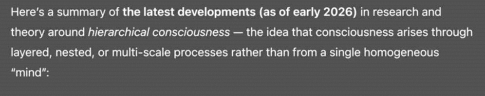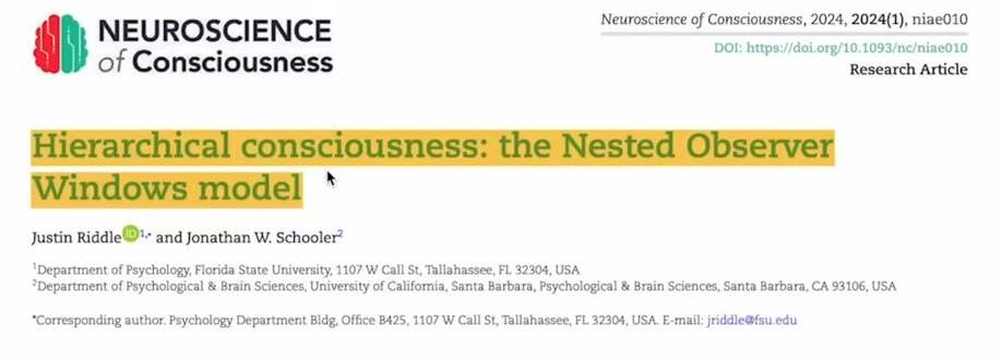图1:What if you are a pixel in a higher-level consciousness 2025 Dec-4 The Nested Observer Window Model Explained,意识不是单一的“意识流”,而是分层的许多意识窗口,最小的意识窗口也许由相互交流的一些细胞组成,许多最小的意识窗口之间的相互交流“涌现”为较高层次的意识窗口,……。这是他的“元意识”实验室最近提出的假说,2025-2026年,根据ChatGPT的综述,这一假说正在收集实验数据。
