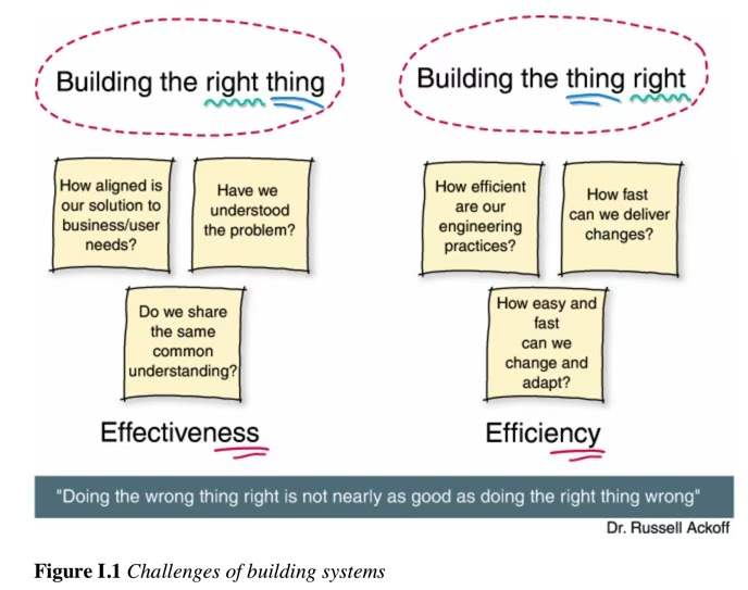 然后是她写的第1章的开篇。构建自适应系统所面临的挑战:构建自适应系统面临着诸多挑战。不断变化的需求、日益激烈的市场竞争、极高的不确定性,以及在这个日益互联互通、相互依存的世界中持续的技术进步,都要求以技术为导向的组织能够预见到变化,并持续进行调整以推动或应对这些变化。那些试图改变或优化系统以适应变化的举措,通常都是针对系统的各个独立部分进行改进的。这些举措往往侧重于对系统各组成部分的局部优化。然而,从系统思维的角度来看,对各个组成部分进行局部优化并不一定能提升整个系统的性能。系统思维运动的先驱之一拉塞尔·阿科夫博士指出:“一个系统不仅仅是其各个组成部分行为的简单叠加,而是这些组成部分相互作用的结果。系统的性能取决于它们之间的协同方式,而非它们单独行动时的表现。”[I.11] 根据阿科夫的观点,如果忽视了组织的系统性特征,那么“他们为提升系统性能所做的大部分努力都注定会失败”[I.11]。在构建各类系统时,面临的挑战在于既要构建出正确的系统,又要确保该系统的构建质量达到预期标准(见图1.1)。1. 这一表述的灵感源自彼得·德鲁克在其著作《有效的管理者》[I.12]中提出的区分:有效性(做正确的事),与效率(把事做对)。打造合适的产品能解决与产品有效性相关的问题,比如该产品是否真正符合用户需求。为顾客创造实质性的价值对企业的成功至关重要,但这需要企业首先理解问题本质,并与各方达成共识。正确地构建某事物至关重要,这关乎效率——尤其是工程实践中的效率。效率意味着优化工作流程并最大限度地提高资源利用率。既要创造价值,又要确保能够妥善地将这种价值传递给用户,这两点都十分重要。这其中需要考虑的因素包括:变更能否迅速实施;变更能否快速且轻松地产生实际效果;以及该组织是否具备适应新环境的能力。做对事情与把事情做好这两者缺一不可。然而,正如阿科夫所指出的:“把错误的事情做好,远不如把正确的事情做好。”[I.11] 约翰·卡特勒则说:“即使是以可持续的方式快速提供了劣质产品,那依然只是劣质产品;除非我们从中吸取教训并付诸行动。”[I.13]要综合考虑各种因素,并始终将效率与效果作为核心目标,从而使组织能够构建出真正符合需求的产品,就必须采取一种整体的视角——这种视角要求我们设计、构建并不断完善那些具备适应能力的社会技术系统,使其能够有效应对快速变化与持续反馈带来的挑战。