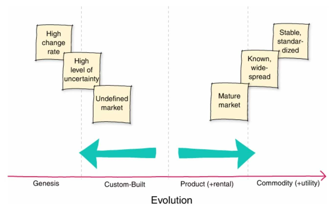 图5,这位女弟子的创新:第1章图6 企业的构件 Adaptive Systems With Domain-Driven Design, Wardley Mapping, and Team Topologies Architecture for Flow 2025 Susanne Kaiser,她刻画了任何一家复杂适应性的当代企业的二维演化地图:横轴是“演化”,有两个方向,向左,进入极端不确定性的领域,向右,进入产品的稳定(饱和或收益递减)阶段;纵轴是“价值”或企业在价值链上的演化定位。根据这张地图,又根据“分形”原理,从宏观到微观,都依照这一模式,画出了丰富的演化地图。我再贴两幅。图6:第1章图7 企业在已知和未知两个方向的演化。图7:第1章图13 效率创新与价值体系的创新。现在已超过两千字限额,只好跟帖。