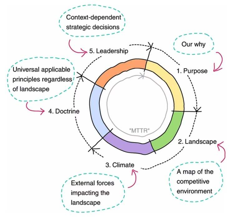 图4,这张图是沃德利从《孙子兵法》里抄来的,他自己这样写:偶然间,我捡到了一本孙子的《孙子兵法》。说实话,我买了好几本不同的译本子,因为书商建议说没有一本完全一样。这是个意外之喜,我欠那个书商,因为正是在读第二本译本时,我注意到我在理解战略时遗漏了一些东西。孙子描述了两个对手之间的竞争中有五个重要因素。粗略地说,它们是:目的、地形、气候、教条和领导力。我在图1(就是这里的图4)中将它们画成一个圆圈。李零认为:先秦百家,源于兵家。中国的兵学,对全世界的管理学而言,始终是最核心的学说。兵家“任势不任人”,兵不厌诈,诸如此类,都是管理学的经典。