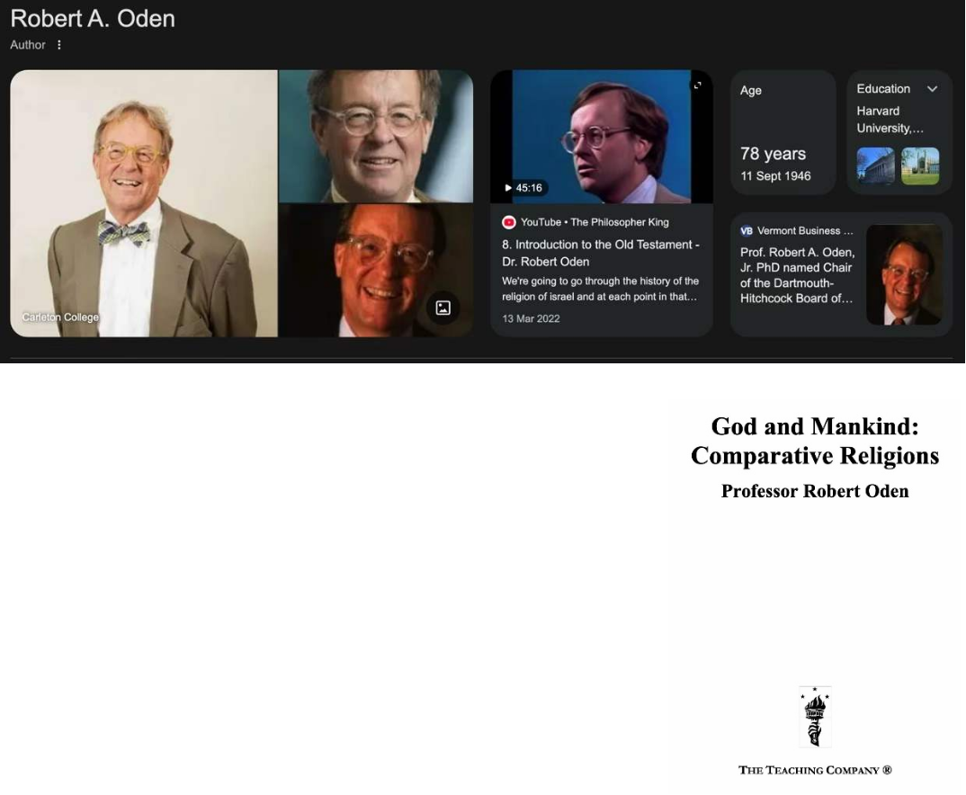 图1:Jewish Philosophy --- The Basics 2026 T M Rudavsky《犹太哲学:基础》,作者是俄亥俄州大学的哲学荣休教授,她的博士学位和硕士学位都在犹太哲学这一领域。本书向学生和感兴趣的读者介绍了两千年的犹太哲学,从最早的诞生到当代。十四章涵盖了中世纪、现代和当代的重要人物,以及犹太思想中几个世纪以来的重要主题和话题。犹太的一神教信仰与西方人的理性哲学之间,始终有难以调解的冲突或紧张关系。她说当年求职面试时,考官严厉询问:你认为“犹太”+“哲学”=严肃的学术问题吗?稍早,有类似的询问:基督教+哲学=严肃学术?我在课堂上推荐过Robert Oden,图2,出生于1946年,他在“伟大课程”系列里讲授的课程是,图5,“God and Mankind:comparative religion”《神与人:比较宗教学》,2015年出版,他的中年时期,1975-1989,在达特茅斯学院任宗教学教授。他毕生研读近东的古代语言,他懂九种语言,他与妻子都浸淫于这一领域,他在课堂上说在家里与妻子的日常对话,不必有前缀“BC”,孩子们都知道他们所指是“公元前”。例如1900,或1800,其实是BC。他大约十年前,