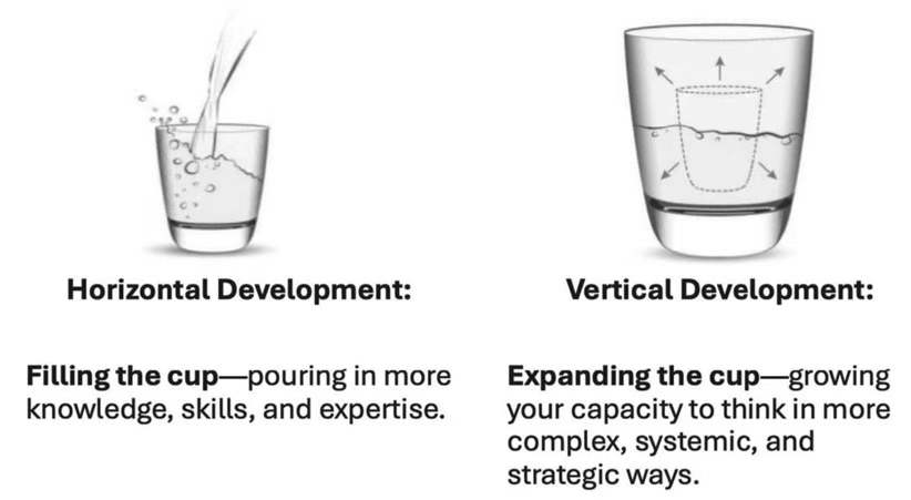 相比之下,纵向发展旨在提升领导者理解和应对复杂性的能力。它并非着眼于增加信息量,而是拓展领导者解读、处理和回应信息的能力。纵向发展可以被看作是培养更广阔、更细致的视角,使领导者学会跨情境思考,关注组织问题的相互关联性,并从系统思维的角度来审视领导力问题。……这种发展方式让领导者经历循序渐进的阶段,每个阶段都代表着更高的认知和情感成熟度。横向发展旨在让领导者“做得更多”,而纵向发展则使领导者能够“成为更好的人”——在自我意识、灵活性和同理心方面成长,这些品质对于应对不确定性及推动变革至关重要。经过纵向发展的领导者有能力超越眼前的挑战,发现潜在规律,并培养出具有韧性和适应力的团队,为应对不确定的未来做好准备。……想象你有一只杯子。这只杯子代表着你的能力——你理解、引领和理解周围世界的能力。大多数传统的培养方式都致力于填满这只杯子,也就是注入更多的知识、技能和专长。其目的是积累经验、学习新的框架,并在所从事的领域变得更称职。这就是横向发展——而且很有价值。但是,当你所面临的挑战需要超出当前杯子所能容纳的内容时,该怎么办呢?这就是扩展“杯子”的意义所在。纵向发展并非仅仅意味着获取更多信息,而是提升我们以更复杂、系统化及战略化方式思考的能力。我们不再只是单纯地了解更多知识,而是开始以不同的视角看待问题——能够识别模式、处理矛盾,并以更高层次的智慧应对不确定性。问题不仅在于“我接下来需要学习什么?”还在于“我该如何成长才能应对未来的挑战?”因为到了某个阶段,仅仅填满“杯子”已经不够了——我们需要扩大它的容量。