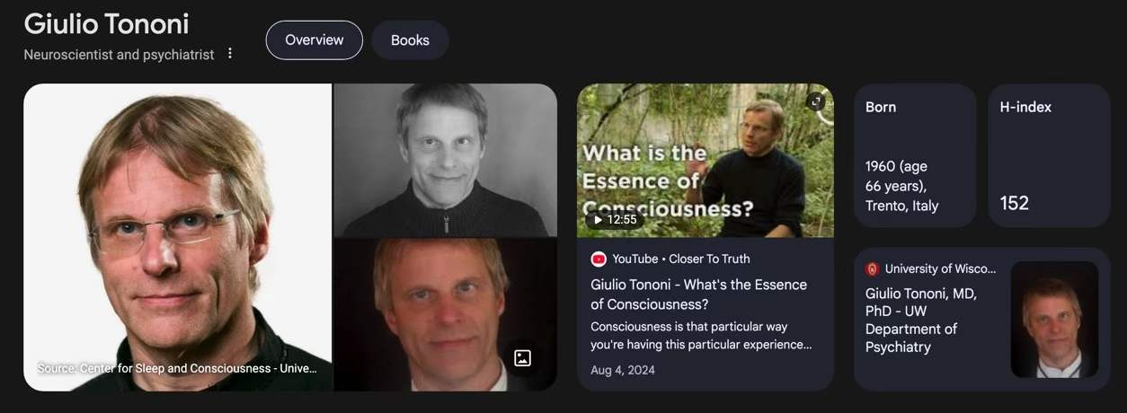现在可以介绍今天的主角,图6:Hans Busstra hosted 2026 Feb-14 Integrated Information Theory Explained by Jeremiah Hendren a member of the Integrated Information Theory (IIT) Lab and long-term collaborator of IIT founder Giulio Tononi,我很喜欢这位主持人(右边这位),在我收集的视频里,他的地位,就纯学术而言,仅次于,就科普而言,远高于,那位是理论物理学家的印度裔主持人。更重要的是,这两位主持人的视频,画面格外清晰,几乎每一个两小时视频都要占用3GB存储。在2026年2月14日的节目里,他的对话嘉宾(左边这位)是我抄录的博客文章里介绍过的托诺尼(图5)现在的弟子,他在托诺尼创建并领导的实验室,研究基于信息理论的“意识”解释。这个视频之所以重要,因为,在两个小时之内,不用黑板和图示,如此解释“IIT”的,也许只有他。何况,这位主持人多次要求他“更科普一些”,于是有了更科普的口语描述。我下载的视频,优势在于,自动生成中文字幕,常有明显错误,恰因是明显错误才不会误导我的理解。