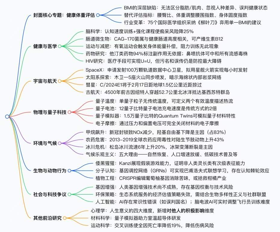 图4:New Scientist 2026年2月14日 思维导图。可见,豆包AI阅读很适合概述英国《新科学家》这类杂志的内容。封面专题值得关注,体重的健康范围,通常根据“BMI”的公式计算:BMI = 体重 (kg) ÷ 身高 (m)²。在最近二十年里,中国人普遍认为这是最新的健康标准。然而,BMI不能区分“肌肉”与“脂肪”,因此,健身主义者,肌肉比重很高,因此“体脂率”非常低,却常被BMI认为“超重”或“肥胖”。例如,很多运动员、健身爱好者 BMI>25 → 被标为 “超重”。其次,BMI不能区分脂肪在身体中的分布。事实上,由于不包括“内脏”(最新研究意味着肠道脂肪甚至有益于健康),人类的下半身积累的过多脂肪,与人类的上半身(包括“五脏六腑”)积累的过多脂肪相比,有更低的健康风险,至少不接近“致命”。第三,“新科学家”指出,BMI的最大弊端,是低估老年人的健康风险。老年人肌肉自然流失,脂肪比例增加,却因体重轻导致BMI“正常”。第四,BMI不适用于(分子人类学的)“东亚人种”(中国、日本、韩国),东亚人种,较低的BMI,很容易积累内脏脂肪,也很容易发生代谢障碍。因此,中国和日本,有更严格的BMI健康范围。新的指标应当包括:1)体脂率,2)腰围/腰臀比,3)血糖、血脂、血压,4)肌肉量,尤其值得注意,“懒人”如果只为“减肥”而减少饮食,通常导致肌肉量占比下降,却减弱了基础代谢功能,所谓“越减肥,越虚弱。”