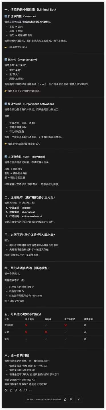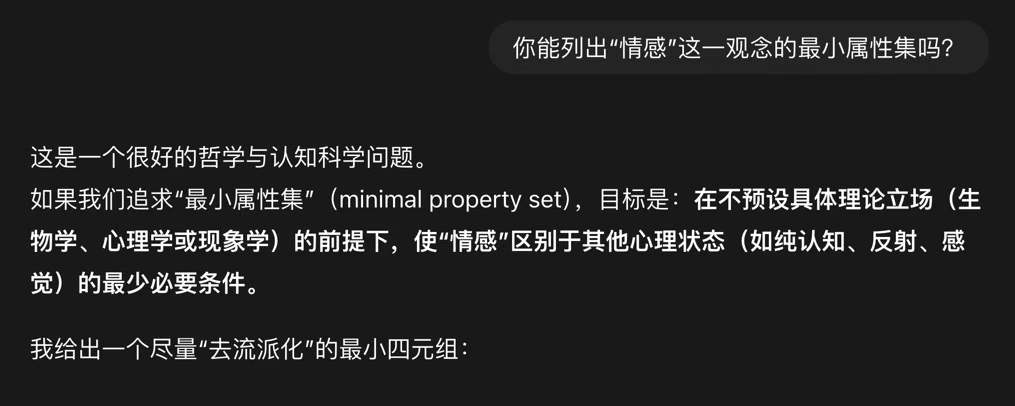 我提醒诸友注意这段译文里出现的“观念”的两重性质,普遍本质与具体特征。我在课堂上多次强调,目前的大语言模型很容易列出任一“观念”的最小属性集,因为这些属性是这一观念所含全部“对象”的通有属性,不能多,也不能少。AI的优势在于,它们积累的人类知识足以让它们以足够高的概率正确预测人类用户赞同的“最小属性集”,或用这里的译文,“普遍本质”。另一方面,大多数人类个体都有能力列出这一观念里的任一特定对象的更多属性,这就是怀特海所说的观念的“具体化”过程,随着认识的演化,观念里的每一对象都有自己的具体化过程。马斯克在2026年1月6日特斯拉最大工厂的办公室里与彼得·戴蒙蒂斯的对话(那次新年对话对未来十年非常重要以致我必须在这里给出诸友翻墙之后在油管里可检索的标题:Elon Musk on AGI Timeline, US vs China, Job Markets, Clean Energy & Humanoid Robots 2026 Jan-6 with Peter H Diamandis)里想象的特斯拉机器人,除了不能改变原子排序之外,都能做到,那些机器人当然也有使“观念”具体化的能力,但因没有人类情感,它们很难如这本书的作者这样,将“爱”这一观念具体化。甚至也很难给出“爱”的最小属性集,如果有自知之明的话。例如,我正在等候ChatGPT回答我的问题:你能列出“爱”这一观念的最小属性集吗?这一版ChatGPT的自知之明远超以前的版本,所以它在犹豫,而且很难回答,图3。但是,我随后提问:你能列出“情感”这一观念的最小属性集吗?它迅速回答,图4,ChatGPT列出“情感”这一观念的最小属性集的四项属性,