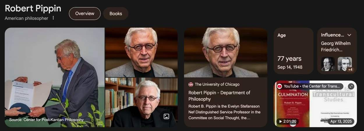 图1:Robert Pippin 1948年9月14日出生,芝加哥大学哲学系教授,芝大社会思想委员会“耐夫杰出服务教授”,他是当代美国最著名的黑格尔专家,中译名是“罗伯特·皮平”。我这里收集的皮平英文著作,始于1990年代,代表作应当是,图5:Robert Pippin 1997 Idealism as Modernism --- Hegelian Variations《作为现代主义的理想主义:黑格尔主义诸变体》。他中年时期的“问鼎之作”,也许是:Robert Pippin 2011 Nietzsche, Psychology, and First Philosophy《尼采,心理学与第一哲学》。他晚年著作似乎更多,几可认为是“巅峰时期”。