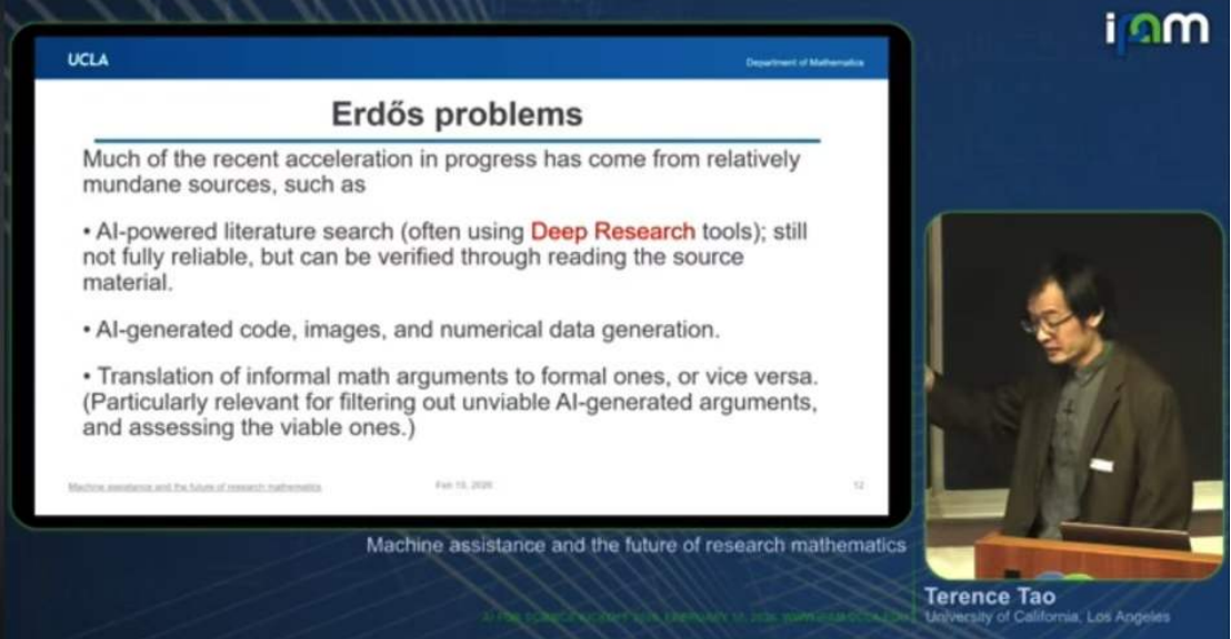 我还应在今晨推荐陶哲轩的最新演讲视频,图7:AI for Science 2026 Kickoff 2026 Terence Tao Fields Medalist, Professor at UCLA, Co-Founder of SAIR Foundation 2026 Feb-10 Machine assistance and the future of research mathematics。陶哲轩被认为有全世界最高的智商(330),他来自澳大利亚的华裔家庭。我在北京大学国家发展研究院的助教马英举出国读博,在UCLA(加州大学洛杉矶分校)经济系深研“微观经济理论”,目前在剑桥大学,来信说过他听陶哲轩讲课的感受。陶是UCLA有史以来以最小年龄(可能是29岁)成为数学正教授的人。当然,现在,他是中年人,图7右下方就是他现在的样子,清瘦,语速极快(这是高智商的典型特征)以致自动生成的中文字幕错误百出,对于我这样经过七年数学训练的人,也很难理解。大致而言,我知道他在介绍他想象中的“AI for Science”(科研辅助型的人工智能或“强化科学家能力的人工智能”)。在这一截图里,这是他2026年2月10日的演讲现场(他也是这家研究机构的联合创始人),他正在讨论,以“合作指数”闻名的数学家厄多斯生前列出的那些待解问题,是否真可借助AI求解。至少在这一页,他持有深切的怀疑态度。他认为数学家必须认真查看AI解题时引用的参考文献,并判断AI的结论是否符合数学直觉。现在,我可能超过了两千字的限制。