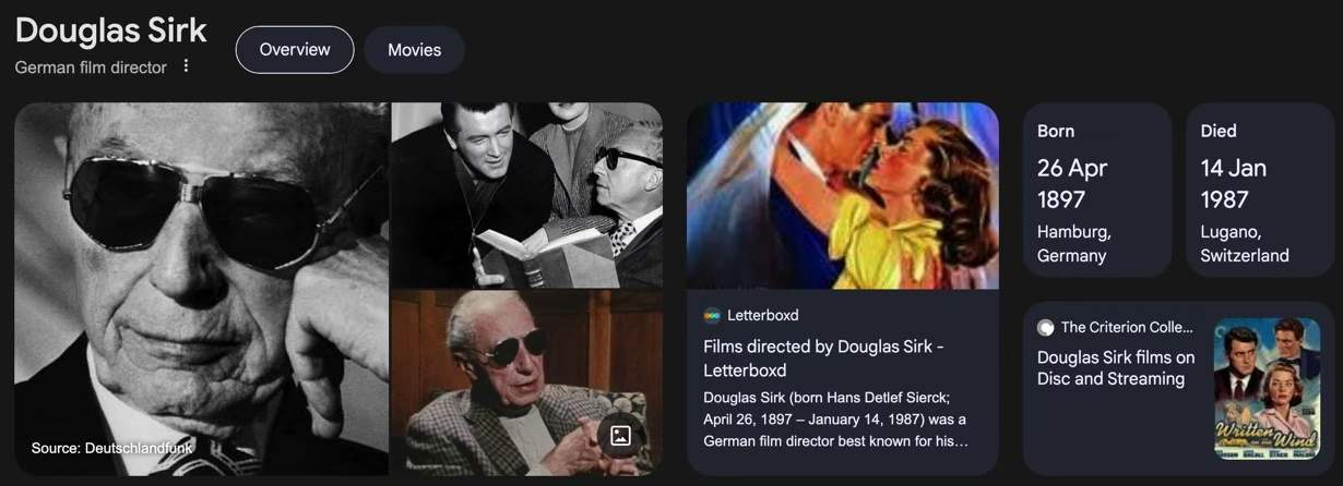 图7:Douglas Sirk,1897-1987,德国人,根据“维基百科”:因他的犹太妻子,为躲避纳粹迫害,1937年加盟好莱坞,成为电影导演,1950年代以执导好莱坞的情节剧而获得商业成功,同时,他还导演喜剧、西部片、战争片。他凭借电影情节剧《壮丽的痴迷》、《天堂允许的一切》、《风中写下》、《爱的时刻与死亡的时刻》和《生活的模仿》取得了最大的商业成功。虽然这些影片最初被影评人批评为感伤女性电影,但如今被电影导演、评论家和学者广泛视为杰作。他的作品被视为“对资产阶级整体,尤其是对20世纪50年代美国的批判”,同时描绘了“被社会条件困住的人物的富有同情心的肖像”。在影片表面之下,瑟克(这是他的另一个译名)还运用复杂的布景和丰富的彩色技术来强调他的观点。啊哈,根据维基百科,他的父母是丹麦人。那么,他的姓氏,译为“瑟克”,也许比译为“希尔克”,更妥当。德鲁克的自传《旁观者》有关于慕尼黑1919年革命的描写,那是瑟克在慕尼黑经历过的极左革命。
