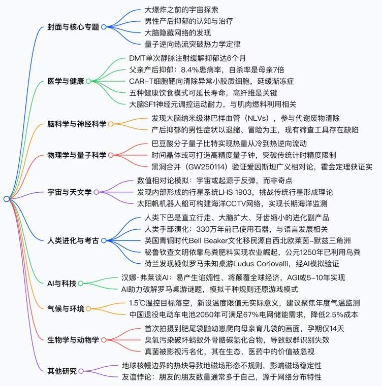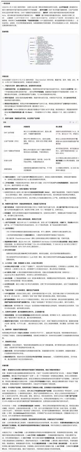 图2,豆包AI阅读的概述。聚焦多领域前沿研究与发现,涵盖宇宙起源(数值相对论揭示大爆炸前的宇宙可能存在反弹或平行宇宙碰撞)、医学与健康(DMT 单次剂量可缓解抑郁、父亲产后抑郁获关注且有专属干预手段、CAR-T 细胞或可延缓渐冻症)、脑科学(发现大脑中潜在的纳米级淋巴样血管 NLVs,或为神经退行性疾病治疗提供新方向)、物理学(量子领域实现热量逆向流动,挑战热力学第二定律)、人类进化(人类下巴是直立行走、大脑变大等进化的副产品,手部演化与工具使用、语言发展相关)等关键领域,同时探讨了AI 的未来影响、气候政策的困境(1.5℃温控目标落空,新设温度限值并无实际意义),还包含考古、动物学、天文学等领域的新发现,如英国青铜时代移民溯源、罗马未知桌游的 AI 分析、黑洞合并验证爱因斯坦相对论等。