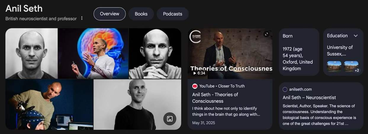 图8:阿尼尔·库马尔·塞斯,是一位英国神经科学家, 现任萨塞克斯大学“认知与计算神经科学”教授。作为“唯物主义”意识解释的支持者,他目前是全球神经科学和认知科学领域被引用次数最多的学者之一。至2017年为止,赛特教授已接受了三次似乎是颅外科全身麻醉手术。这一节目的主持人,图8左边的这位,是我最喜欢的几位年轻主持人之一。图9:Reality Is A Controlled Hallucination 2026 Feb-28 Anil Seth a world-leading neuroscientist who has made important contributions to our understanding of reality as a controlled hallucination,这次面对面访谈的主题仍是介绍他多年来在苏塞克斯大学主持的研究项目。访谈的现场,就是他的实验室,以前可能是一座小教堂。他说目前已收集了四万多名被试的实验数据,也许是全世界这一领域最庞大的数据。如访谈标题所示,被试在实验现场,于黑暗中突然出现许多闪光,他们在闪光的瞬间感觉有许多色彩和图像(幻觉)。事后回忆或画出来当时的感觉,千差万别,四万多人。其实只有白色闪光,频率也保持一致。可见,人们对同一闪光有许多不同感受,这就是“生存的你”当时的意识,唯一地是你的意识,而不是他人的意识。他这本书虽然是2021年写的,由于作者在“意识科学”领域的权威性,价值仍远超博兰2026年那本新书。如果诸友读不懂我写于疫情期间的三篇博客长文“从系统生物学到意识发生学”(上、中、下),那么,赛斯2021年这本书就是我那三篇文章的最佳辅助教材。而且更权威,因为,赛斯与托诺尼(“信息整合理论”的创立者)有过至少一次面对面的争论(二人的研究思路在当年分歧较大),也因此,赛斯在这本书里详细且令人信服地解释了托诺尼的理论。他指出,托诺尼的理论目前是意识研究最主流的学说(因数学太复杂而始终无法设计临床检验)。事实上,科赫“晚年”(他已退休)也开始鼓吹托诺尼的信息整合理论。